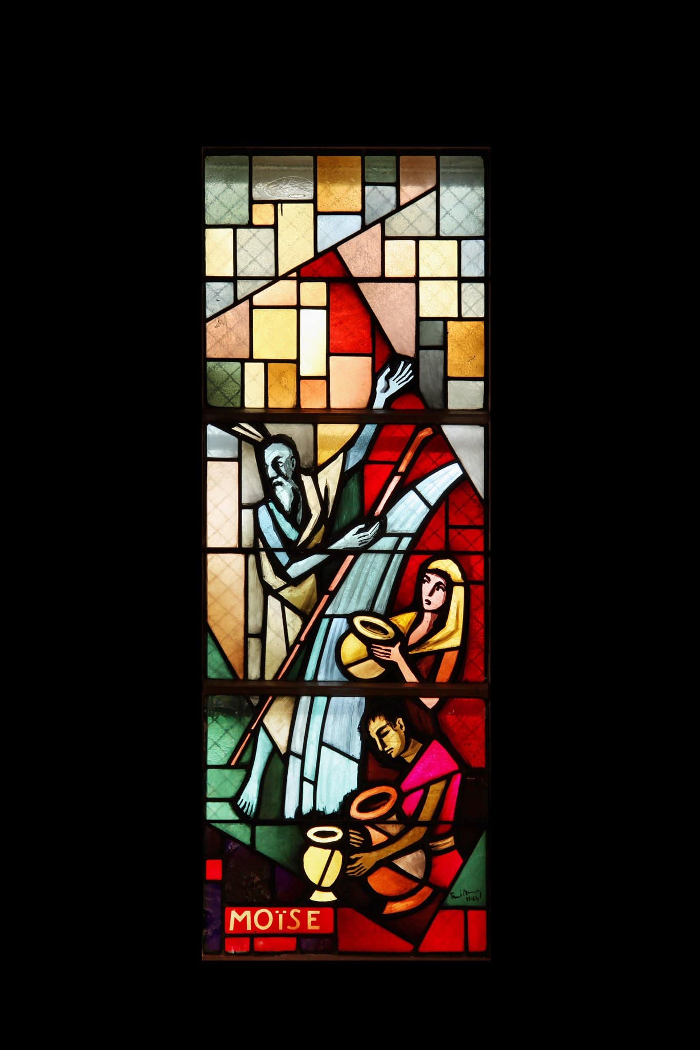 Moïse fait jaillir de l’eau du rocher avec son bâton. Une jeune femme et un jeune homme l’a recueille dans des jarres.