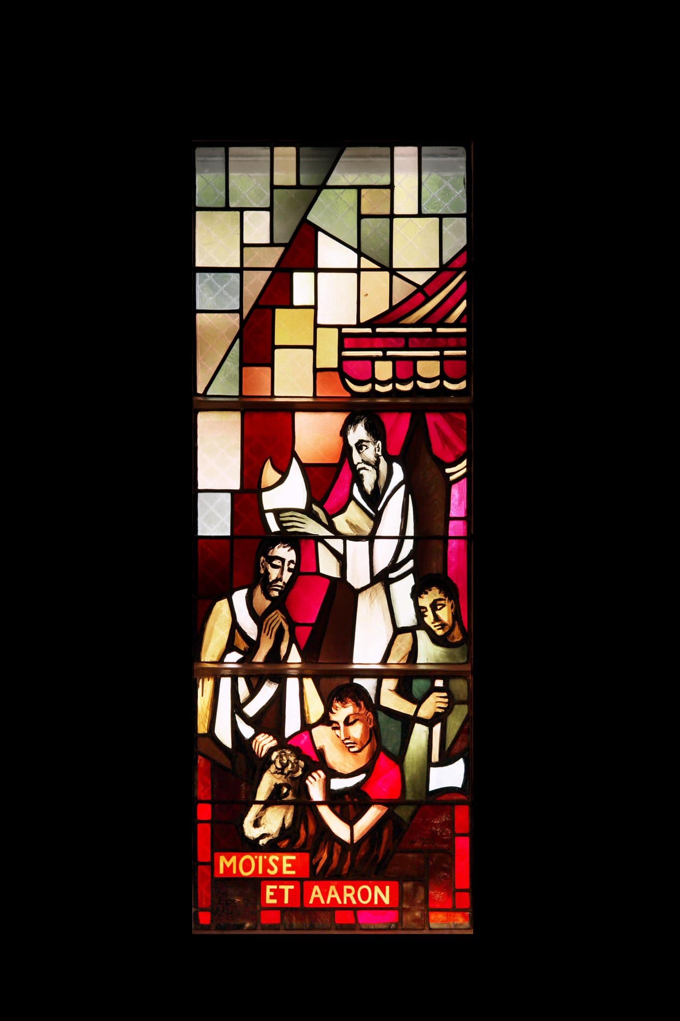 Moïse consacre son frère Aaron, premier souverain sacrificateur, en le coiffant d’une tiare. Au premier plan, un homme tient un taureau par les cornes alors qu’un second, tenant une hache, est prêt à le sacrifier.