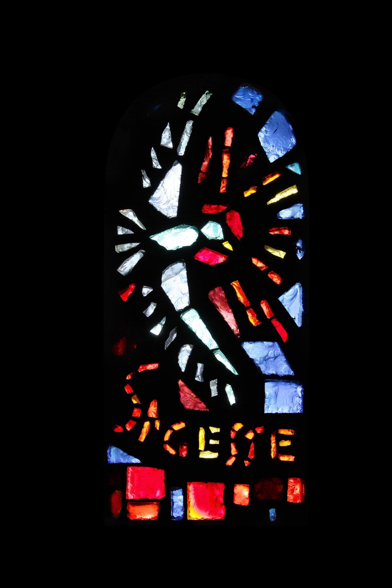 Une colombe en vol, la tête entourée de rayons lumineux.