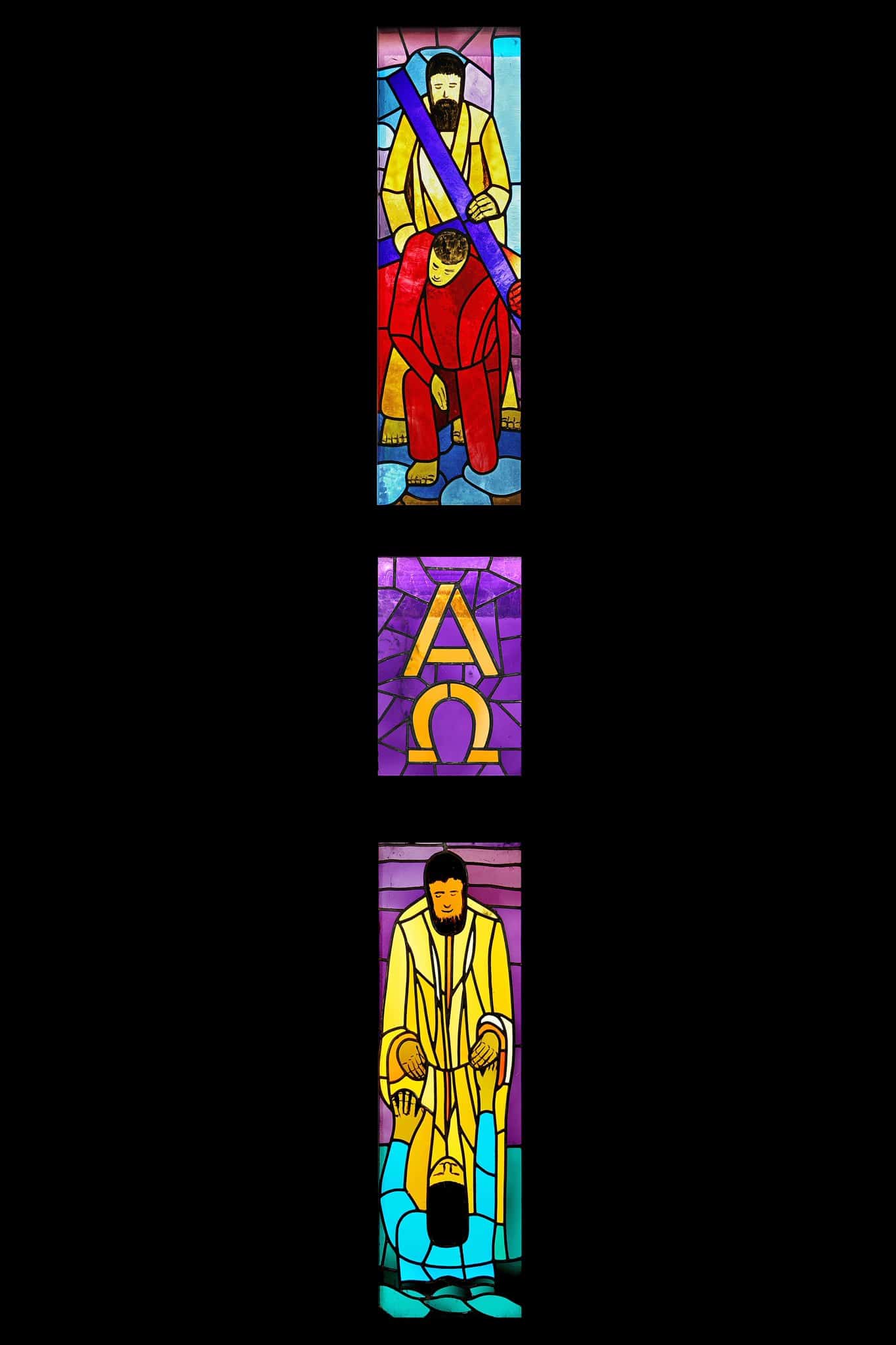 Simon de Cyrène aide le Christ à porter sa croix. L'alpha figure au-dessus de l'oméga sur fond violet. Le Christ tient Pierre par les mains et le sort des eaux (de haut en bas).