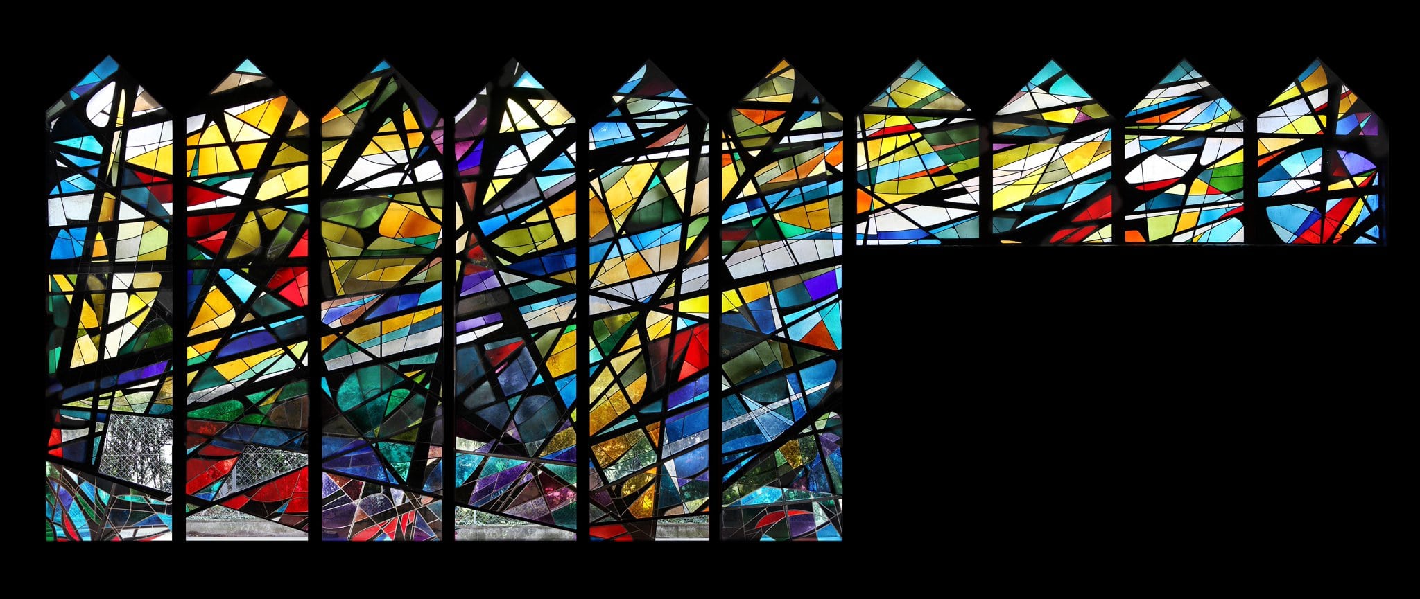 Vitrail monumental abstrait composé de dix panneaux dans les tons de jaune, rouge, vert et bleu.