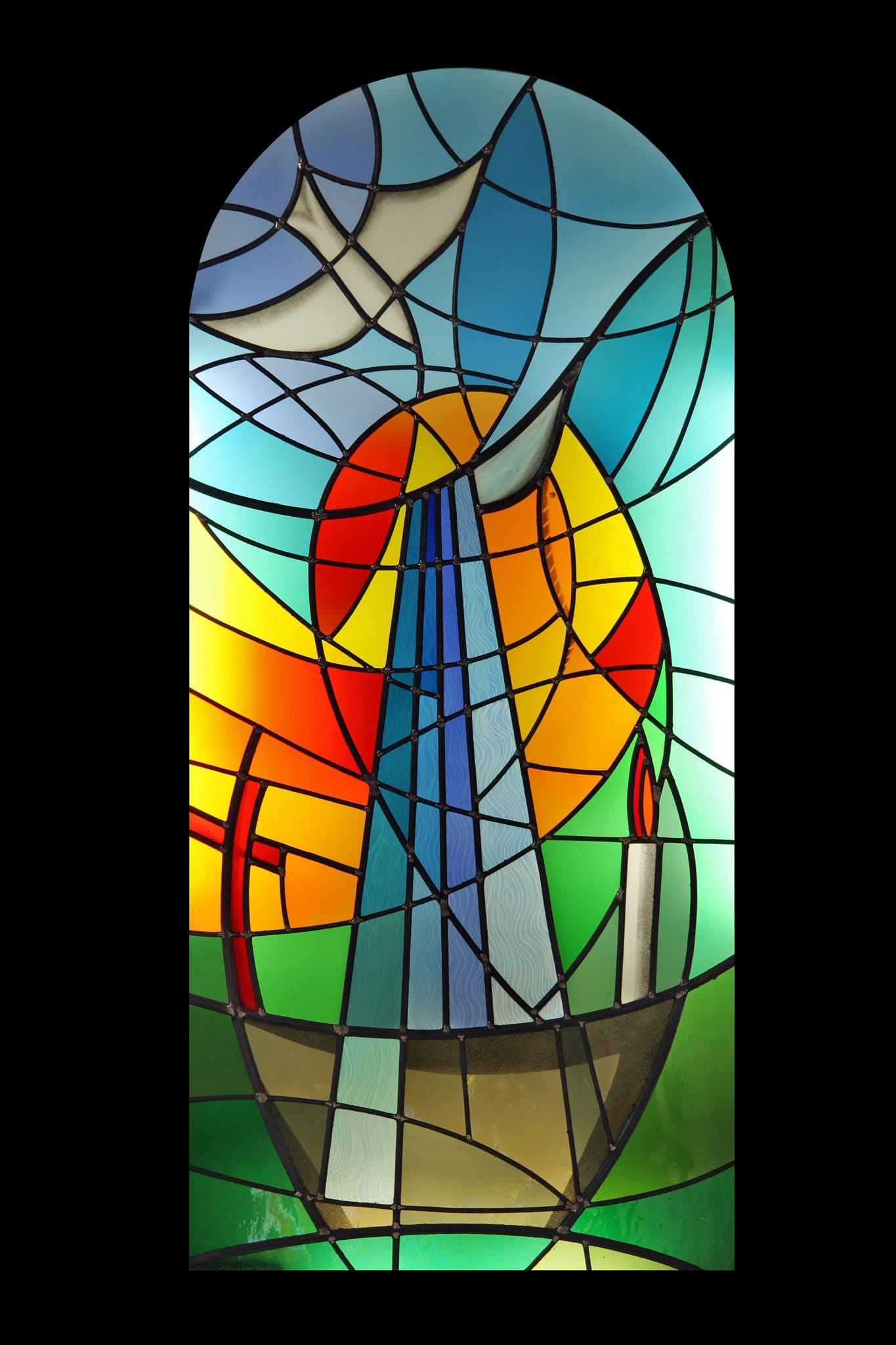 Au centre, de l’eau, symbole de vie, descend dans une cuve surmontée d’une croix et d’un cierge. Une colombe en vol domine la représentation. Une lumière divine éclaire la scène.