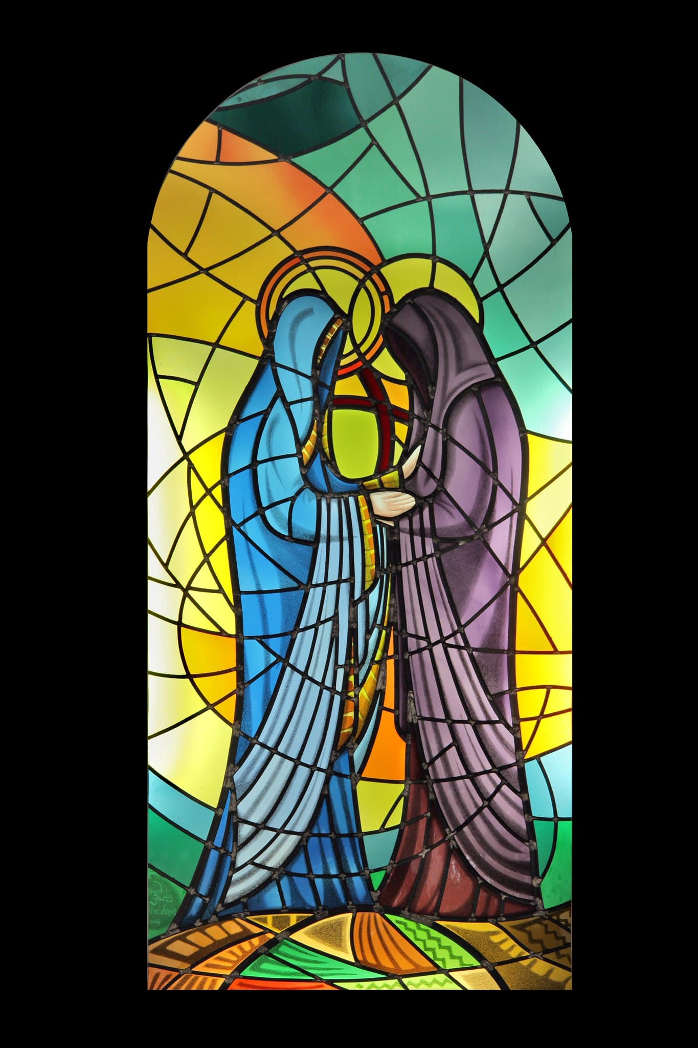 Marie, vêtue d’une robe bleue, symbole de pureté, fait face à Elisabeth en habit rouge-violet. Elles se tiennent par les bras et sont toutes deux auréolées. Une croix est figurée entre elles.