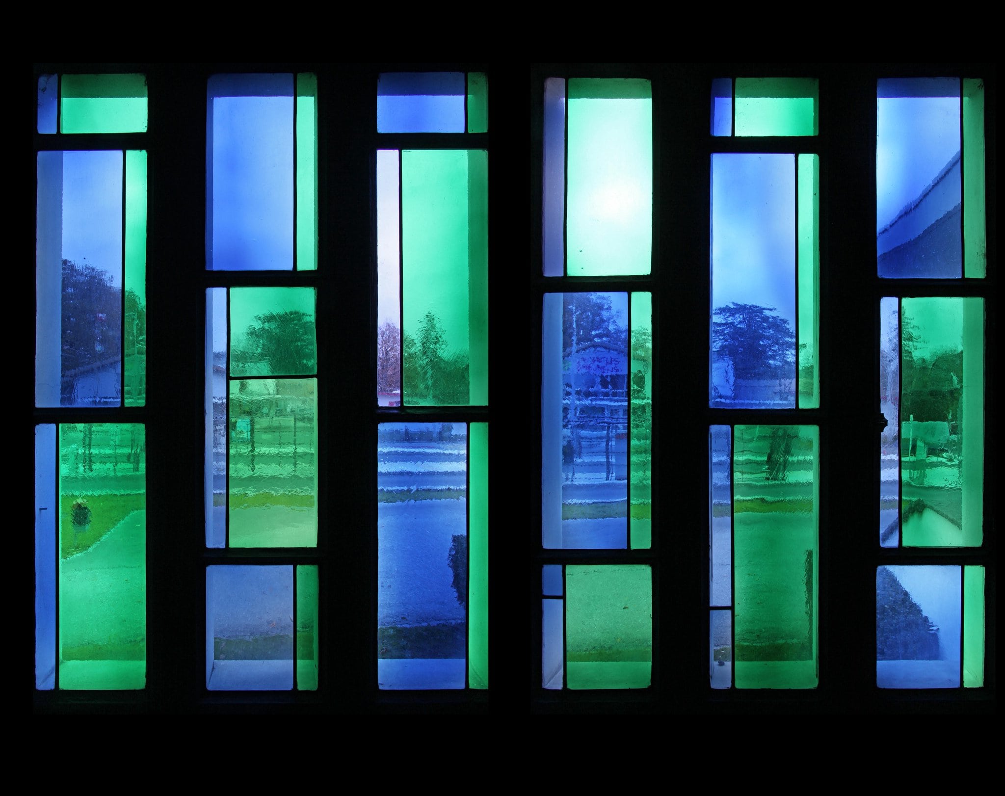 Vitrail non figuratif composé de six panneaux aux teintes bleues, vertes et blanches.