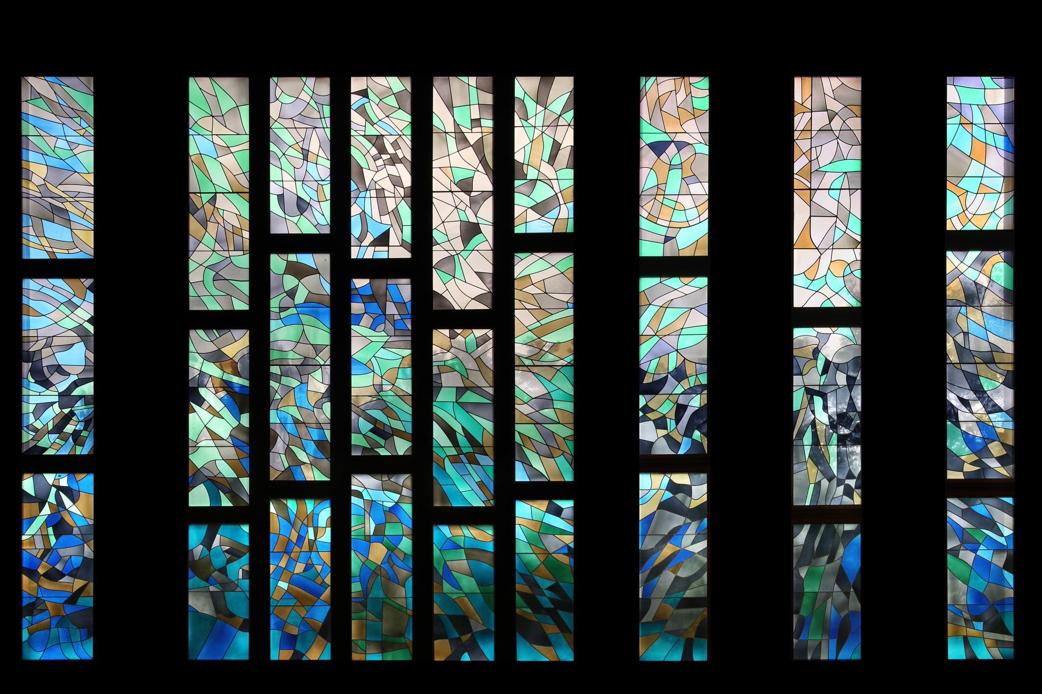 Vitrail non figuratif composé de neuf panneaux dans les teintes vertes, bleues, beiges, jaunes et brunes.
