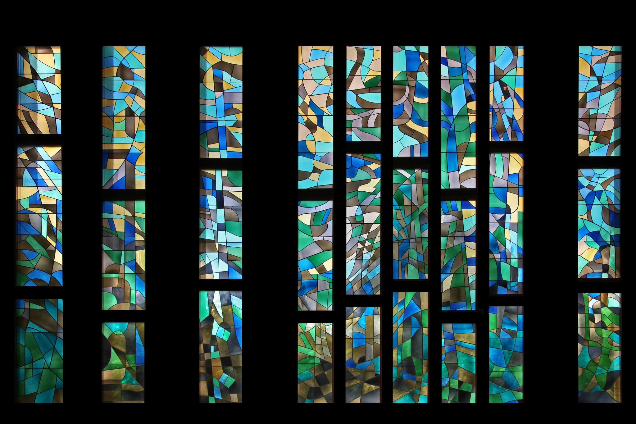 Vitrail non figuratif composé de neuf panneaux dans les teintes vertes, bleues, beiges, jaunes et brunes.