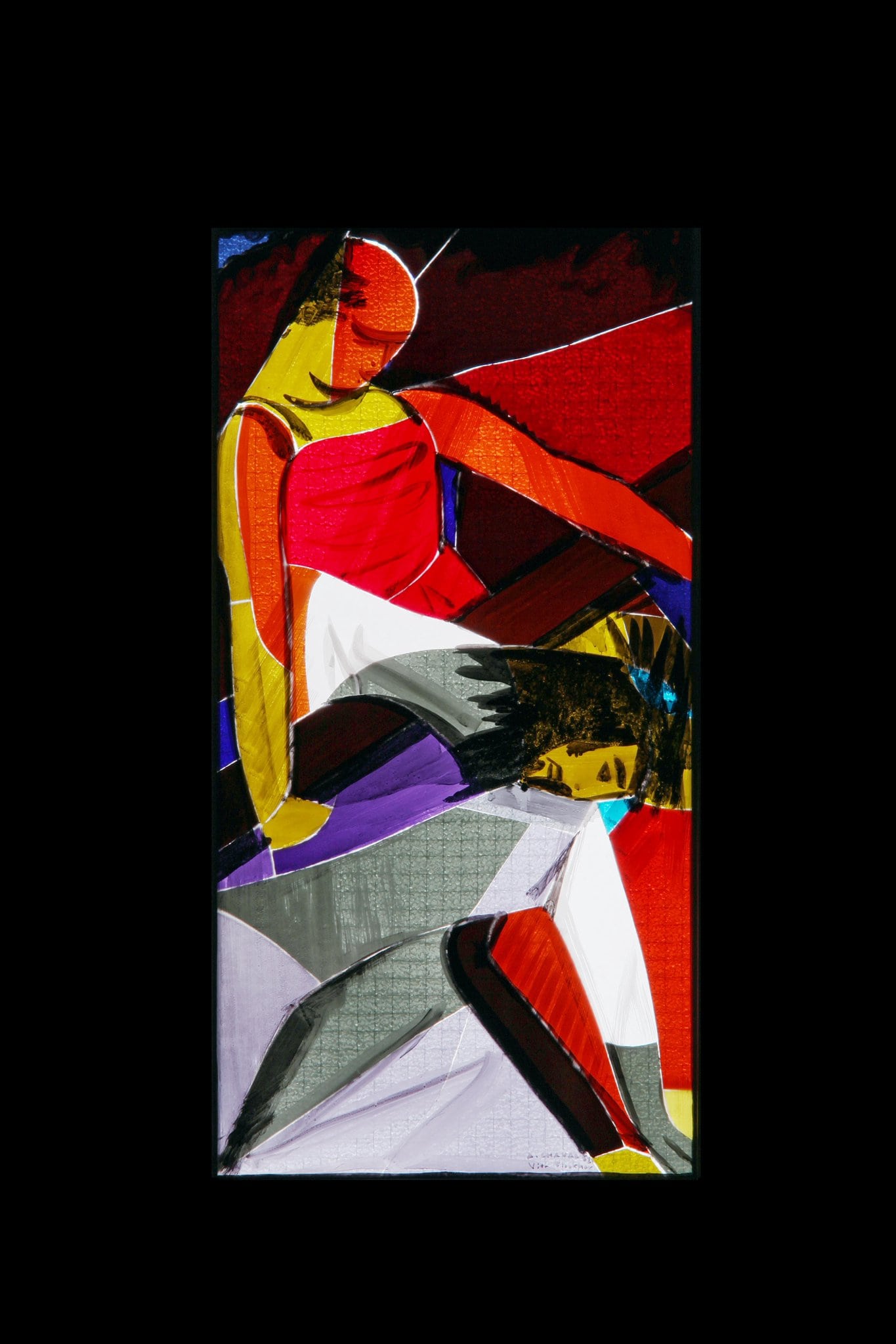 Cette technique a été mise au point au début des années 1940 par l’artiste genevois Alexandre Cingria, en collaboration avec le verrier fribourgeois Herbert Fleckner, en pleine Seconde Guerre mondiale, alors que le plomb est devenu rare. Cingria avait mis plusieurs années à mettre au point cette technique, souhaitant obtenir une composition qui ne soit pas assombrie par le plomb (Moullet, 1947, p. 5). Il l’a expérimentée avec succès à la fin de sa vie pour les vitraux de la chapelle Notre-Dame des Marches à Broc (par exemple GSL_350). Chavaz, qui a peut-être eu connaissance de cette nouvelle technique par Fleckner ou par Cingria avant son décès, ce dernier ayant été une personnalité importante pour les débuts du jeune artiste, utilise ce procédé pour la première fois en 1955 à la chapelle des Religieuses-Hospitalières-de-Valère à Prarion (Thurre, 1985, p. 18-19). Il va le réemployer en 1965 pour le chemin de croix de l’église Saint-Boniface à Vercorin, puis en 1973 à l’École cantonale d’agriculture à Châteauneuf, où il réalise une grande baie sur le thème du pain et du vin (Thurre, 1985, p. 16, 22).
