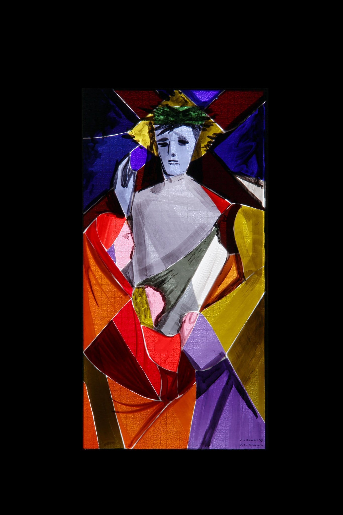 Cette technique a été mise au point au début des années 1940 par l’artiste genevois Alexandre Cingria, en collaboration avec le verrier fribourgeois Herbert Fleckner, en pleine Seconde Guerre mondiale, alors que le plomb est devenu rare. Cingria avait mis plusieurs années à mettre au point cette technique, souhaitant obtenir une composition qui ne soit pas assombrie par le plomb (Moullet, 1947, p. 5). Il l’a expérimentée avec succès à la fin de sa vie pour les vitraux de la chapelle Notre-Dame des Marches à Broc (par exemple GSL_350). Chavaz, qui a peut-être eu connaissance de cette nouvelle technique par Fleckner ou par Cingria avant son décès, ce dernier ayant été une personnalité importante pour les débuts du jeune artiste, utilise ce procédé pour la première fois en 1955 à la chapelle des Religieuses-Hospitalières-de-Valère à Prarion (Thurre, 1985, p. 18-19). Il va le réemployer en 1965 pour le chemin de croix de l’église Saint-Boniface à Vercorin, puis en 1973 à l’École cantonale d’agriculture à Châteauneuf, où il réalise une grande baie sur le thème du pain et du vin (Thurre, 1985, p. 16, 22).