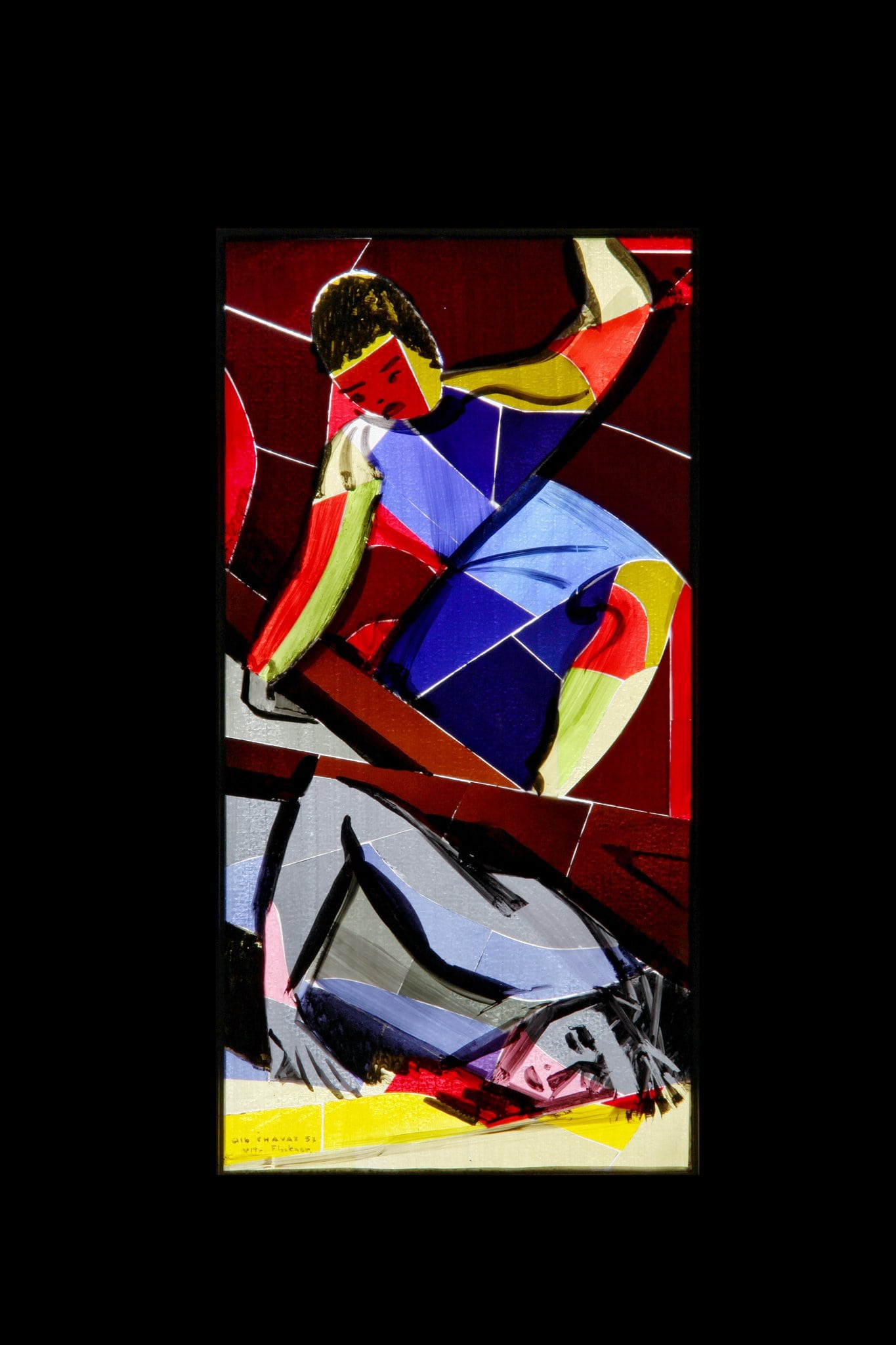 En avril 1954, les grands vitraux à losanges sont presque tous posés, adoucissant non seulement l’atmosphère de l’église mais semblant aussi agrandir l’espace intérieur. En octobre, Chavaz vient poser deux stations du chemin de croix à titre d’essai pour vérifier que les teintes choisies se marient avec les verrières de Dunand et le reste de l’église (Bulletin paroissial, 1954a et b). La paroisse manquant d’une grande part du budget pour ces oeuvres, elle ne peut commander fermement les verrières à l’artiste. Elle lui demande néanmoins de dessiner les cartons et l’assure que c’est lui qui les réalisera (Chamay, 1955a et b). Chavaz propose de faire d’autres essais. Pour équilibrer l’ensemble, il souhaite réaliser les quatorze stations simultanément (Chavaz, 1955). La paroisse reçoit une subvention de la Fondation Gleyre, à la condition de pouvoir se faire un avis sur la qualité des œuvres graphiques de l’artiste (Chamay, 1956). En décembre 1956, Chavaz et Herbert Fleckner viennent donc apporter les maquettes à la paroisse et poser quatre verrières pour contrôler les teintes in situ (Chavaz, 1956). L’ensemble des vitraux est posé en mai 1957 (Chamay, 1957). Sur le conseil de Chavaz, quelques pièces de verre des fenêtres à losanges apportant une lumière trop vive sont assombries avec une couleur opaque (Chavaz, 1957).