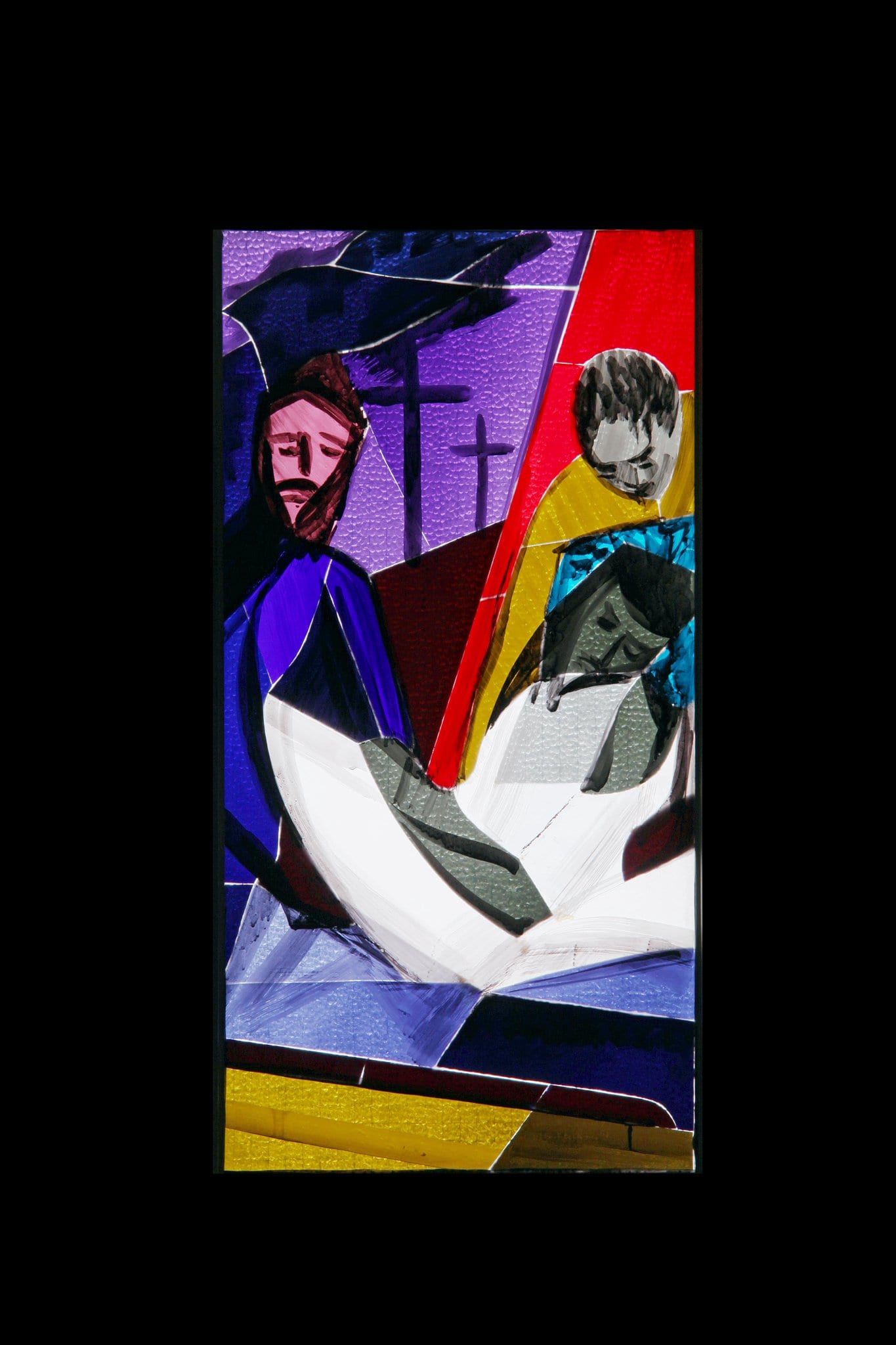 Ce vitrail, illustrant la quatorzième station du chemin de croix, est l’oeuvre de l’artiste Albert Chavaz. Il a été réalisé en 1957 en collaboration avec l’atelier fribourgeois d’Herbert Fleckner pour la nef de l’église du Christ-Roi au Petit-Lancy. C’est le jeune verrier Michel Eltschinger qui a la charge de cette réalisation, alors qu’il termine son apprentissage (M. Eltschinger, communication personnelle, 23 novembre 2022).