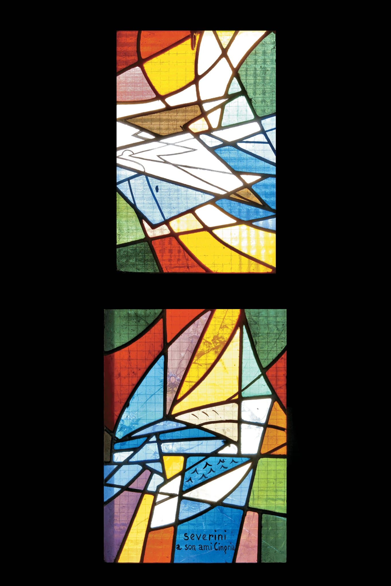 Verrière non-figurative composée de deux panneaux, ce vitrail de Severini est un hommage du peintre italien à son ami suisse Alexandre Cingria, comme l’indique l’inscription au bas de la fenêtre. Les deux artistes ont l’occasion de travailler à plusieurs reprises sur les mêmes chantiers, comme sur celui de l’église de Semsales, au milieu des années vingt, leur première collaboration. Severini s’occupait des peintures murales, alors que Cingria, malgré le souhait du Toscan qui le considérait comme l'un des meilleurs peintres-verriers suisses et souhaitait le voir obtenir la réalisation de l’ensemble des verrières de l’édifice, ne se voit confier que quelques vitraux (Radin, 2011, p. 18). Leurs liens se renforcent les années suivantes. Il se retrouvent encore à Lausanne en 1933 pour la décoration de l’église catholique Notre-Dame, où Cingria réalise les vitraux des lunettes du choeur et de la tribune des chanteurs, et Severini la nouvelle polychromie du sanctuaire et la grande peinture murale de l’abside. On sait par une note issue des archives de la paroisse que Severini s’est rendu à l’atelier Chiara pour “corriger” les vitraux du choeur de Cingria afin que ceux-ci mettent au mieux en valeur la peinture qu’il est en train de réaliser (Severini, 1933). Une vraie confiance s’était forgée entre les deux artistes au fil des années. Severini, comme Stocker, fait don de son vitrail à la paroisse du Petit-Lancy.