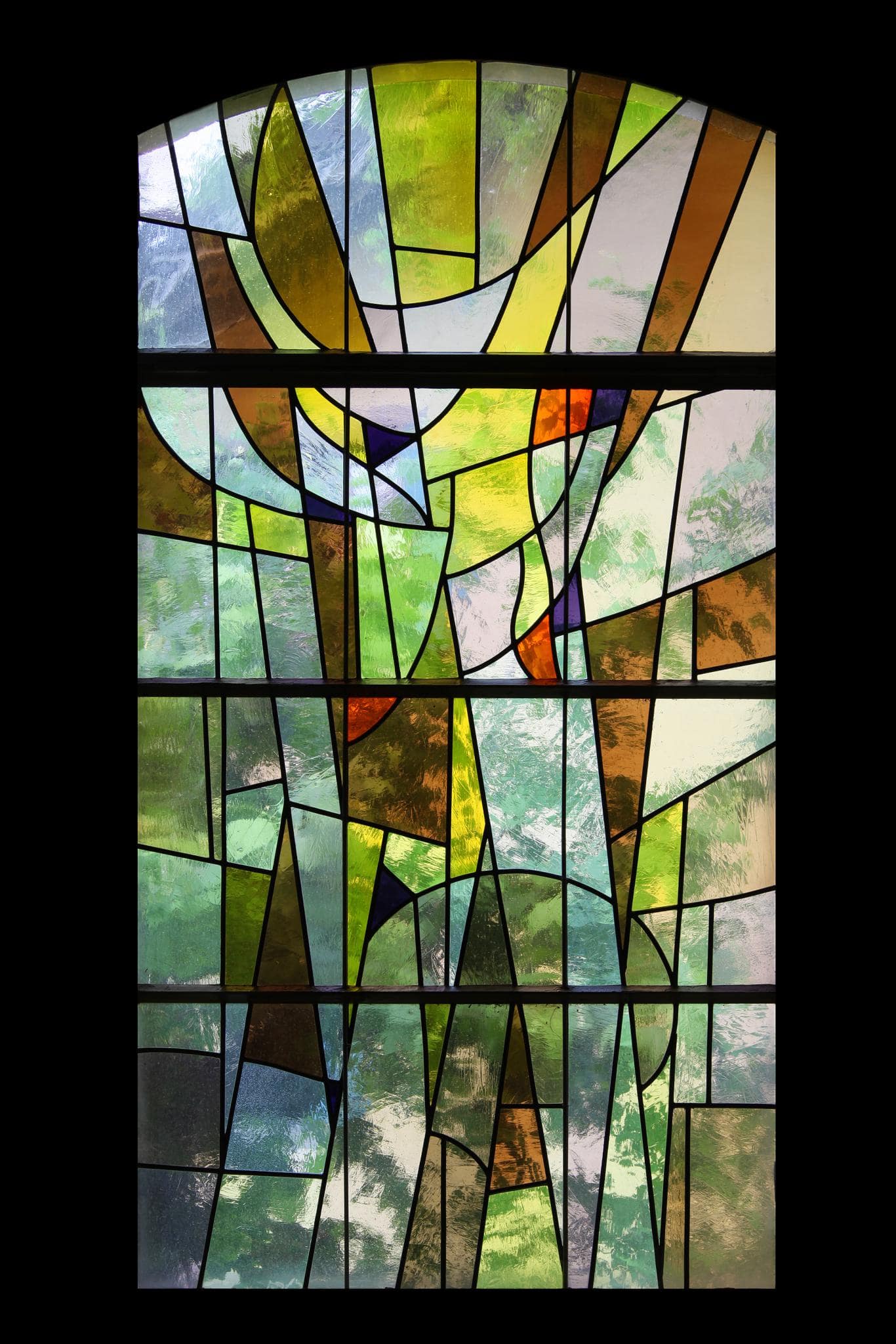 Vitrail non figuratif composé de verres aux teintes transparentes jaunes, brunes, oranges et blanches.