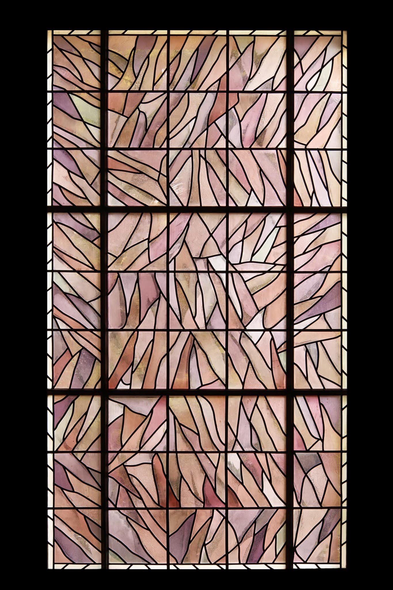 Vitrail non figuratif composé de verres roses, mauves et blancs et entouré d’une fine bordure blanche.