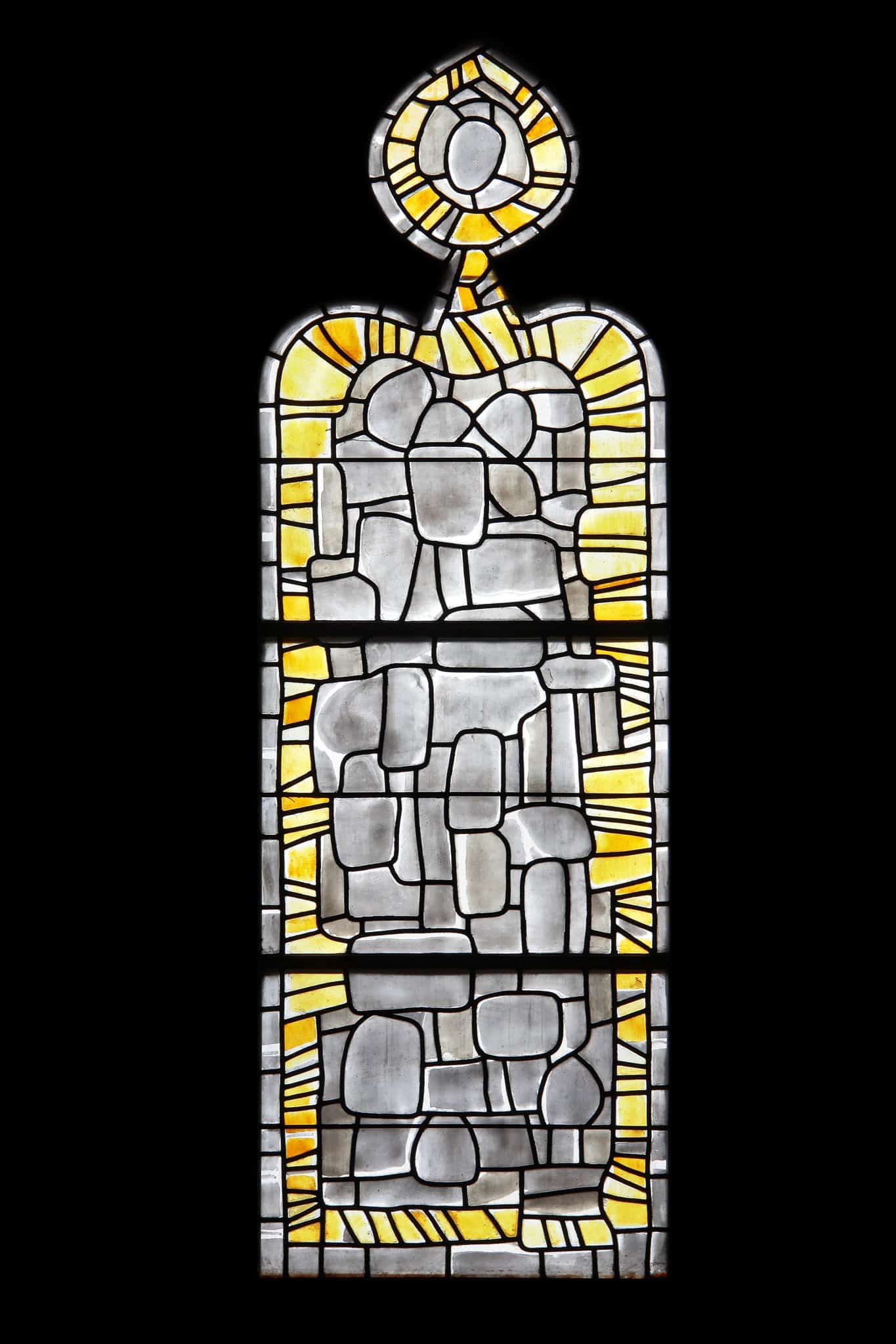 Vitrail non figuratif composé de verres gris et d’une double bordure grise et jaune.