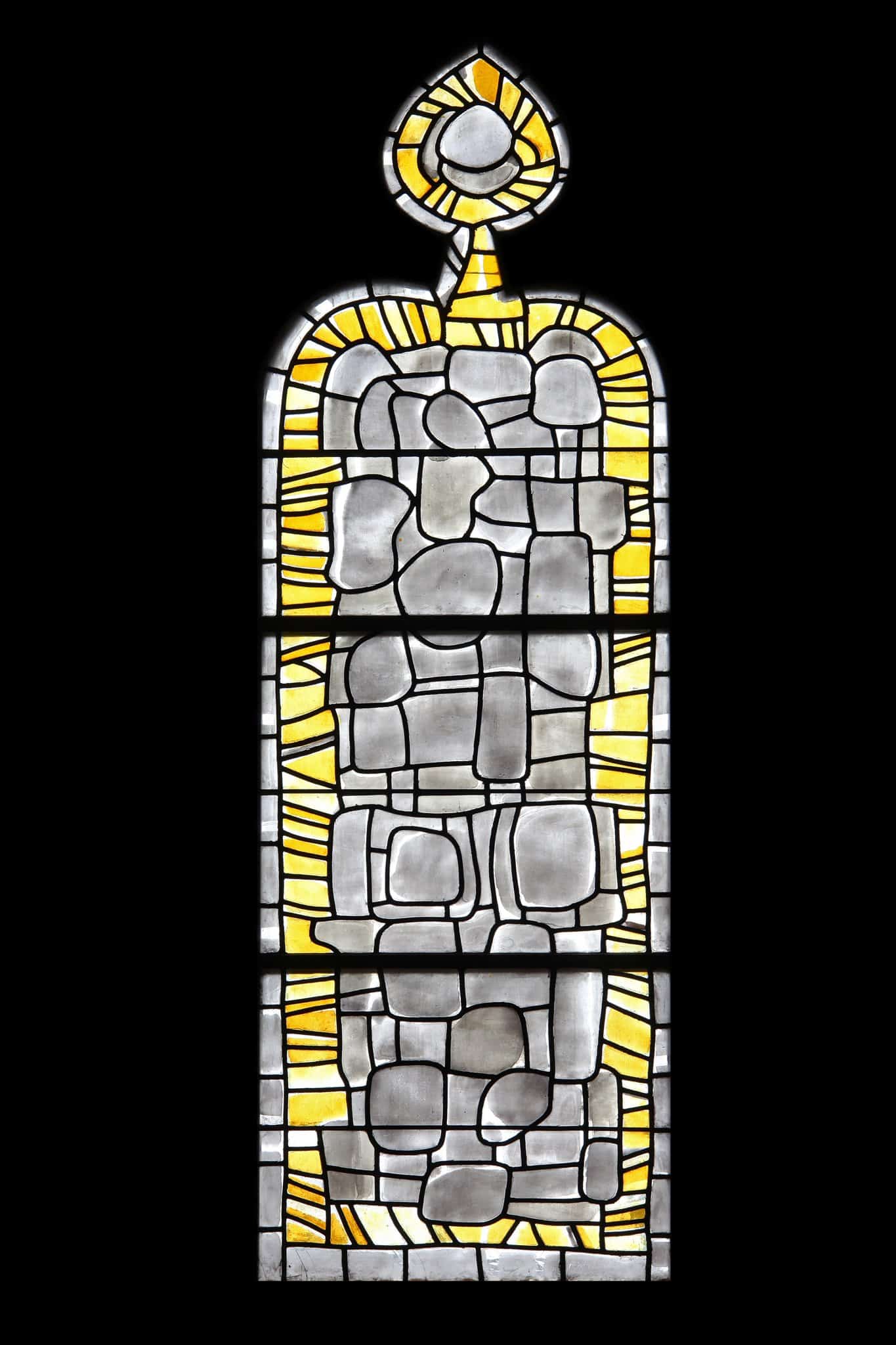 Vitrail non figuratif composé de verres gris et d’une double bordure grise et jaune.