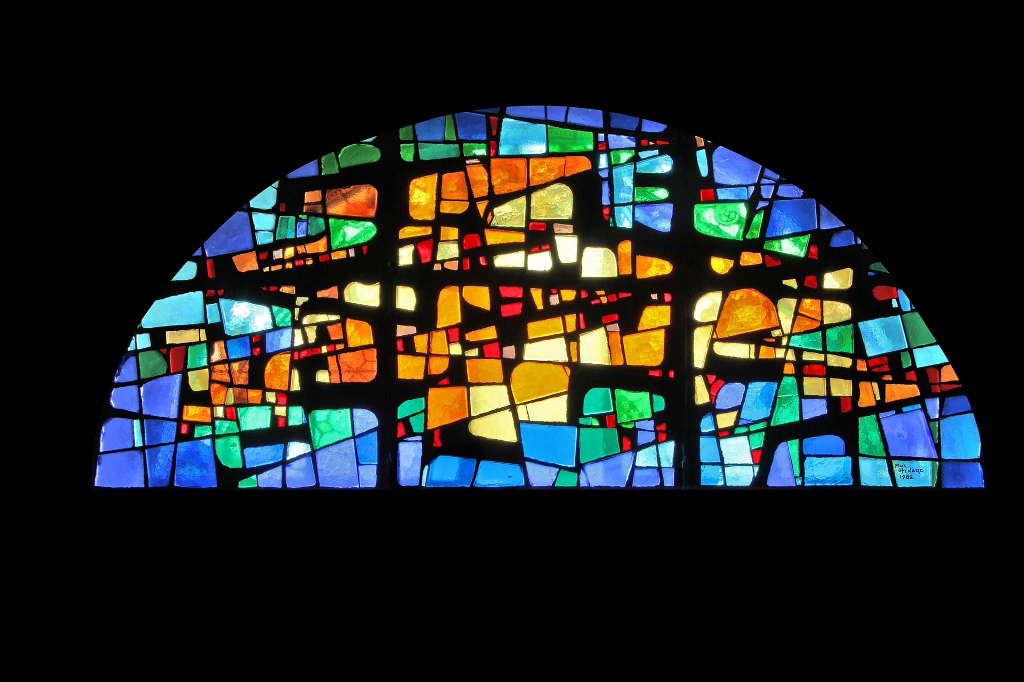Vitrail non figuratif en demi-cercle aux teintes bleues, vertes, oranges, rouges et jaunes. Féérie de bleux célestes comme le concert des anges du Sanctus qui nous intègrent à leur louange de Dieu.