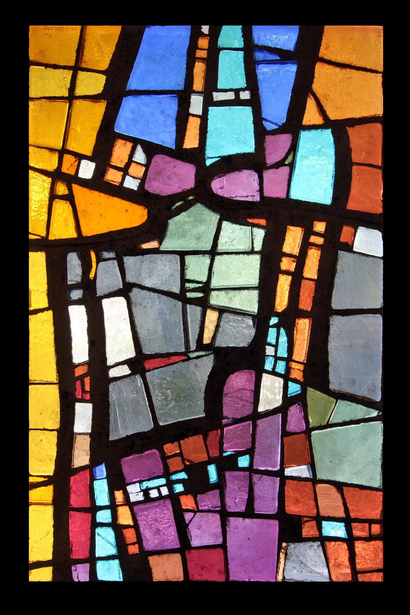 Vitrail non figuratif aux teintes grises, mauves, bleues, vertes et jaunes.