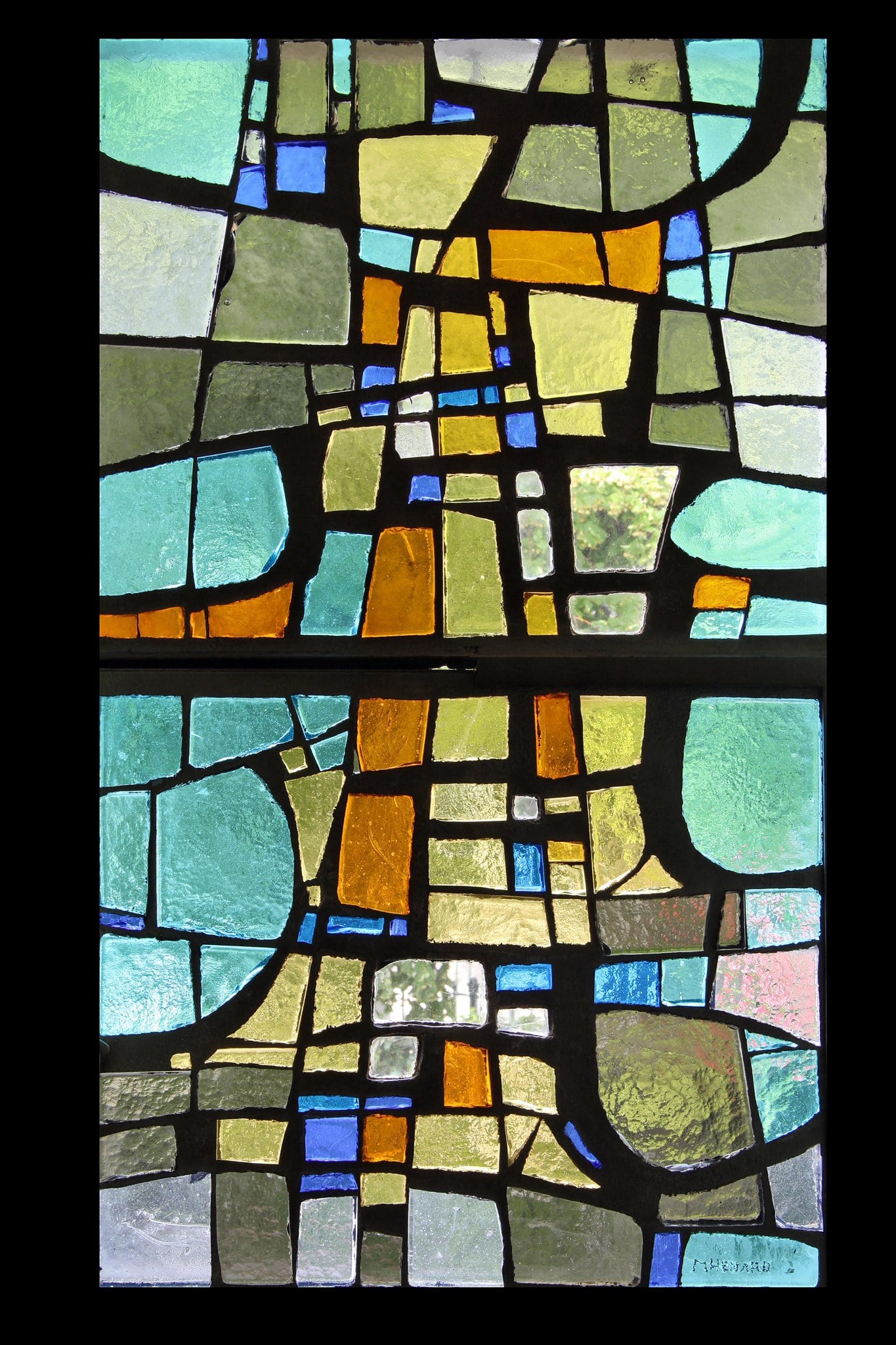 Vitrail non figuratif aux teintes bleues, vertes, jaunes et grises.