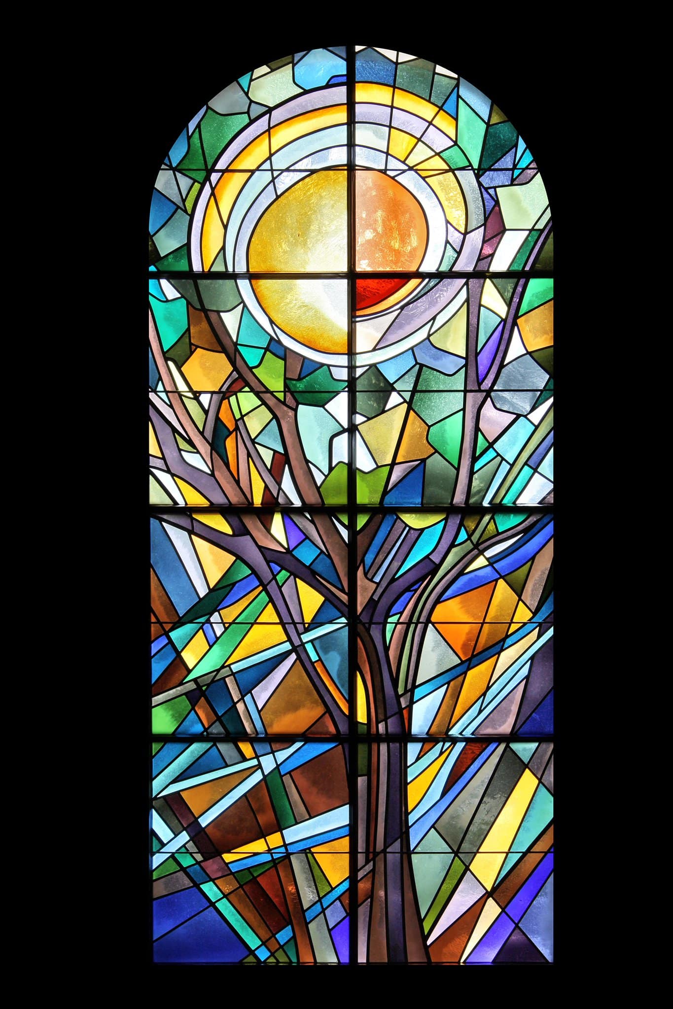 Source biblique : Deutéronome 32, 1-4 : “Terre, écoute les mots que je vais prononcer que ma parole tombe comme la rosée” (citation posée à côté du vitrail).