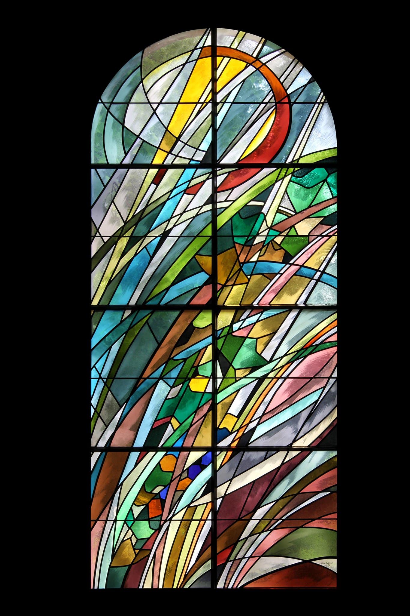 Source biblique : Jean, 3, 8 : “Le vent souffle où il veut, mais tu ne sais d’où il vient ni où il va. Ainsi en est-il de quiconque est né de l’Esprit.” (citation posée à côté du vitrail).