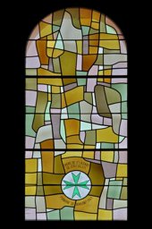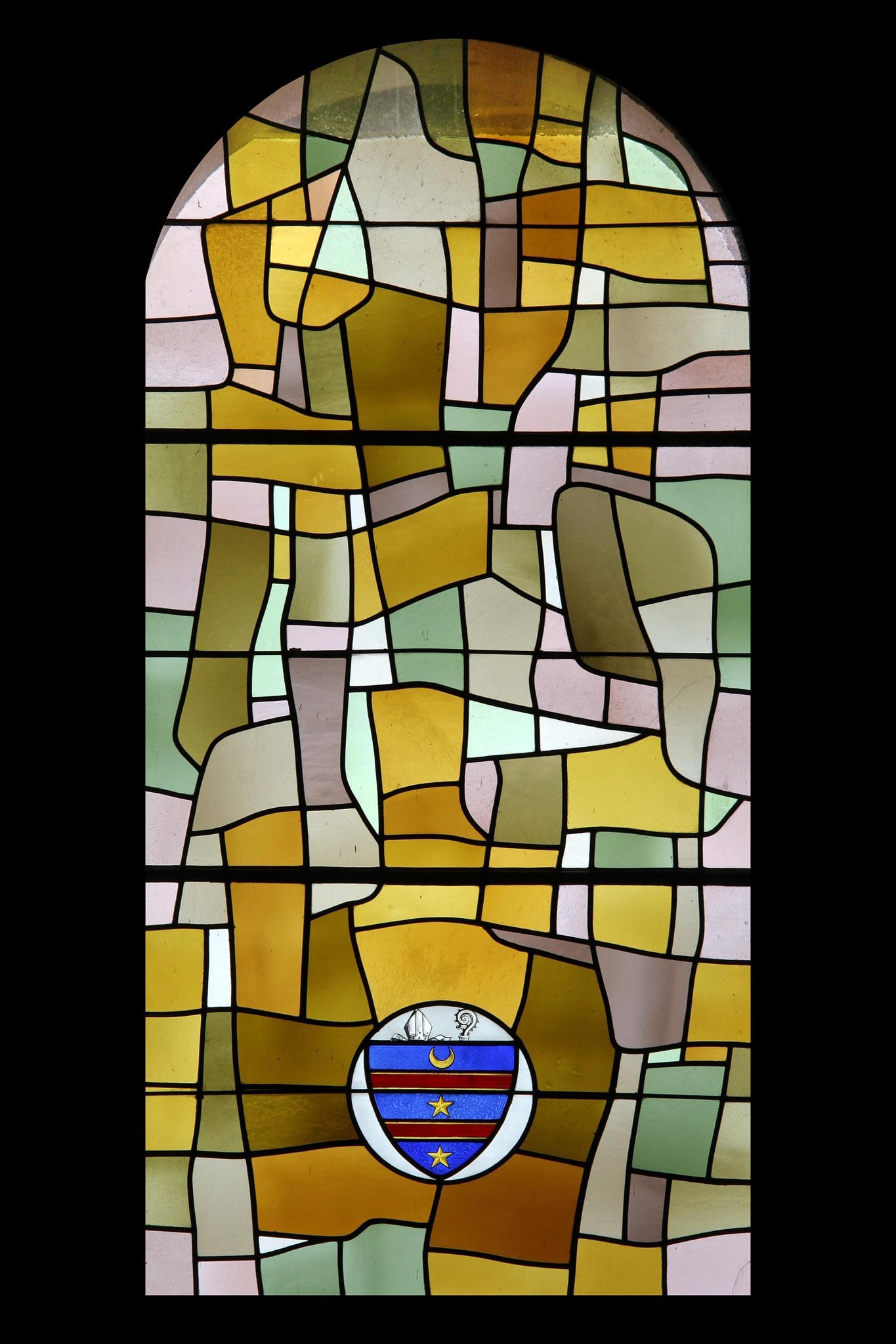 Vitrail non figuratif composé de verres beiges, jaunes, verts et mauves avec les armoiries de saint François de Sales en bas au centre.