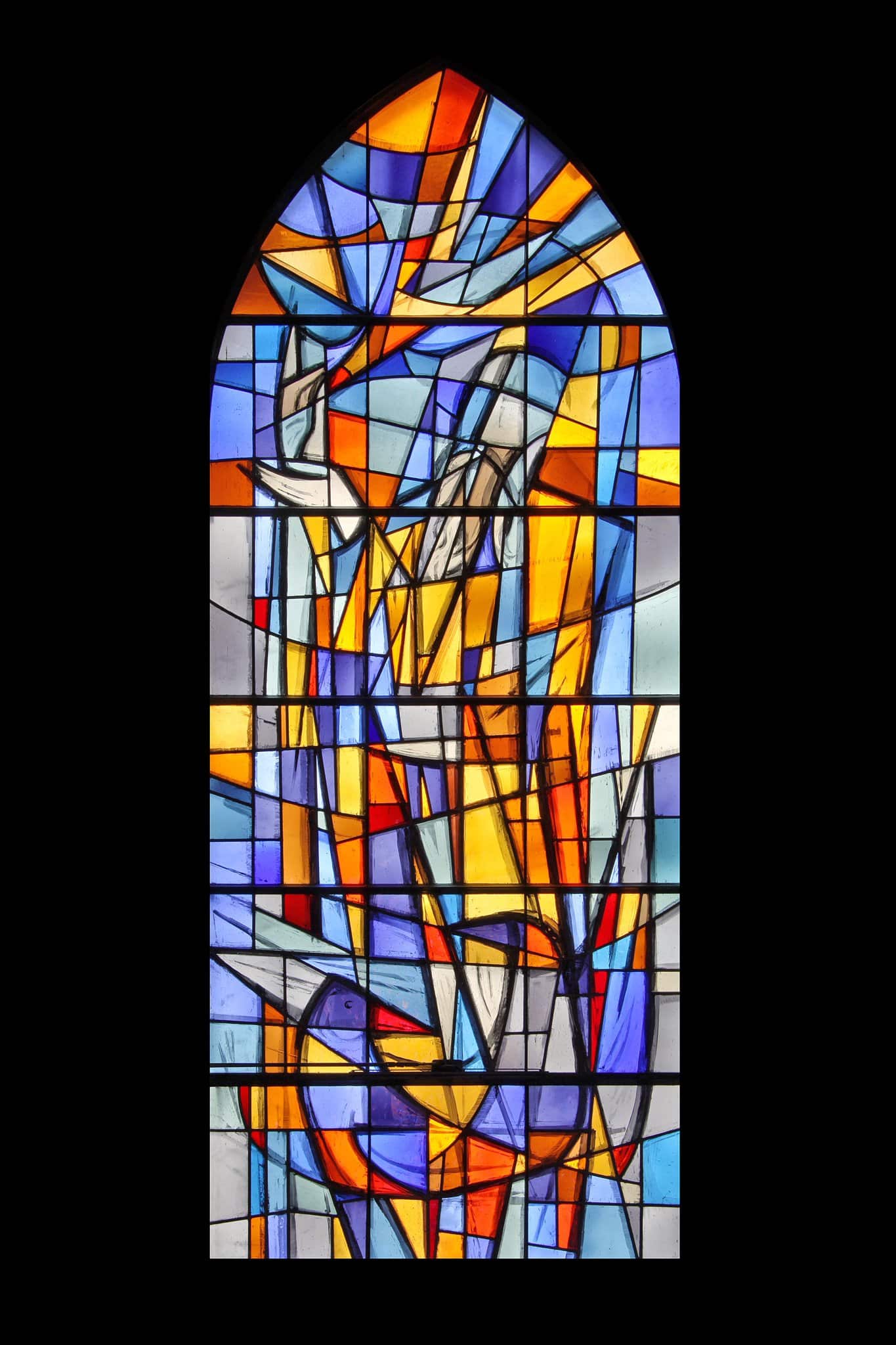 Dans un style semi-figuratif, Elie tend ses mains vers le ciel et reçoit la nourriture d’un oiseau de feu plutôt que d’un corbeau traditionnel. Au premier plan, apparaissent deux corbeaux.