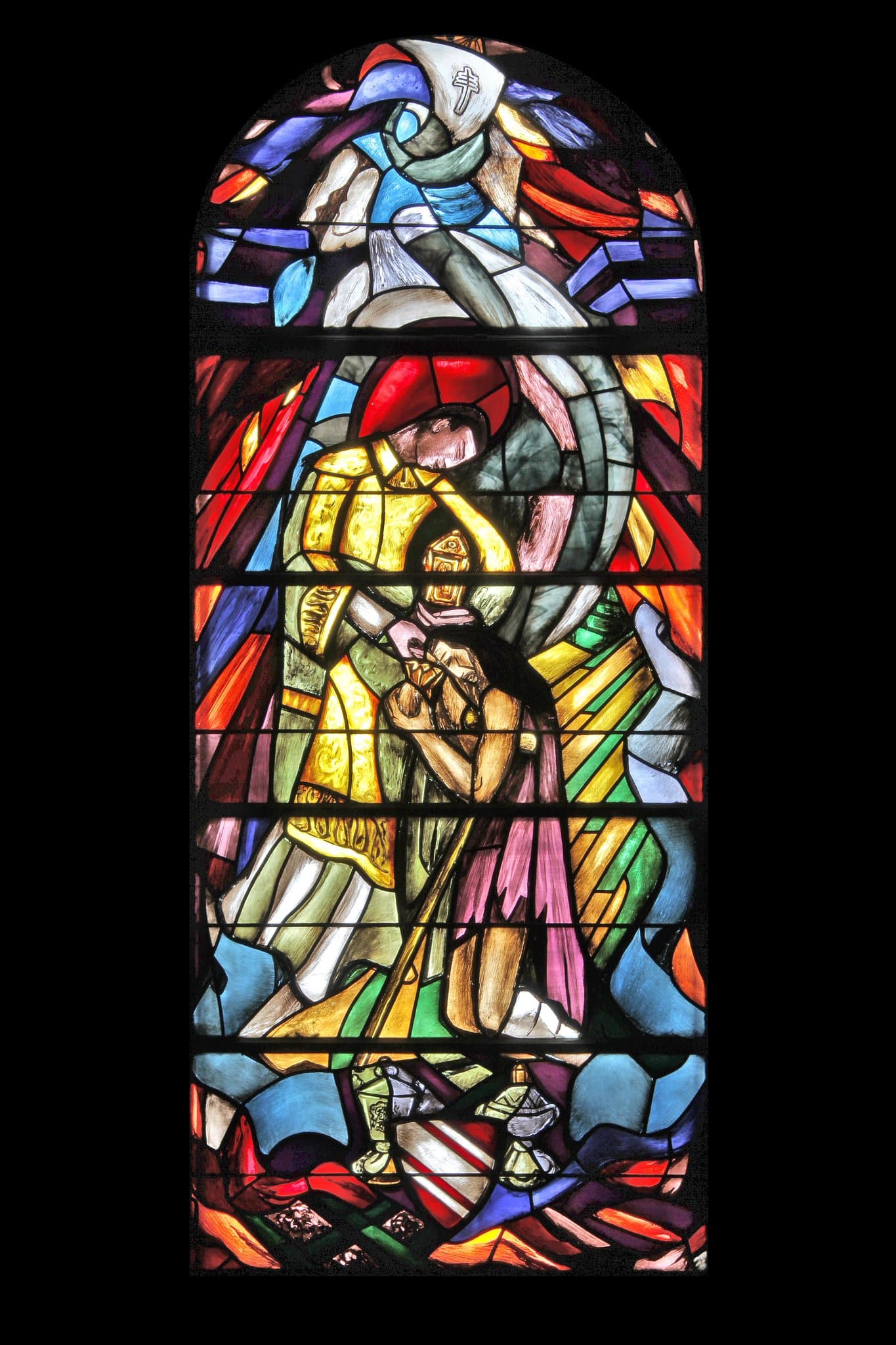 Saint Laurent donne les biens de l’Eglise à un pauvre agenouillé devant lui. Au-dessus la nef de l’Eglise traversant la tempête. En-dessous les armes de Christophe de Livron, recteur de la chapelle en 1509.