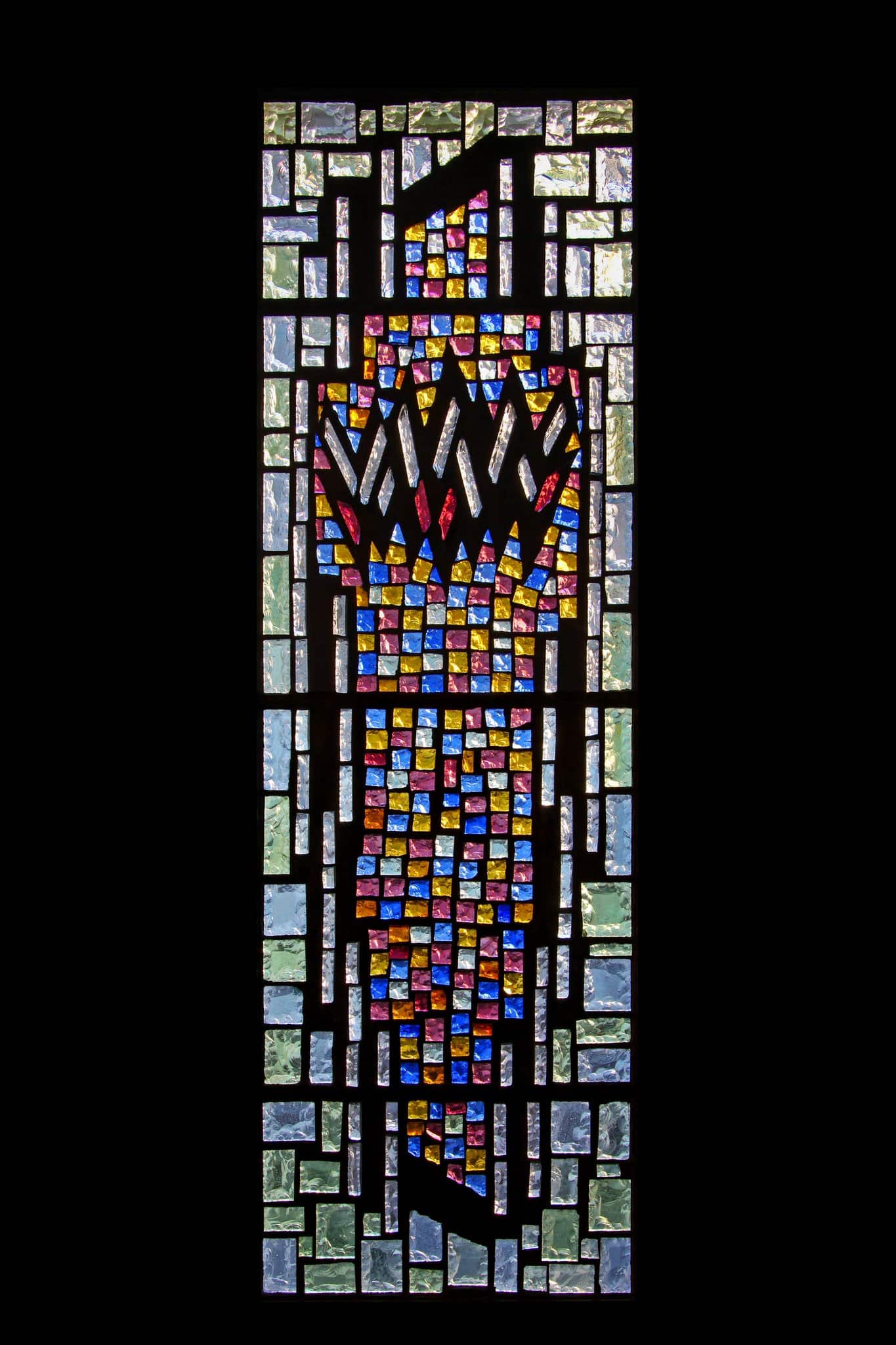 Une couronne d’épines sur un fond de mosaïque rouge, bleue, blanche et jaune, encadrée d’une bordure claire.