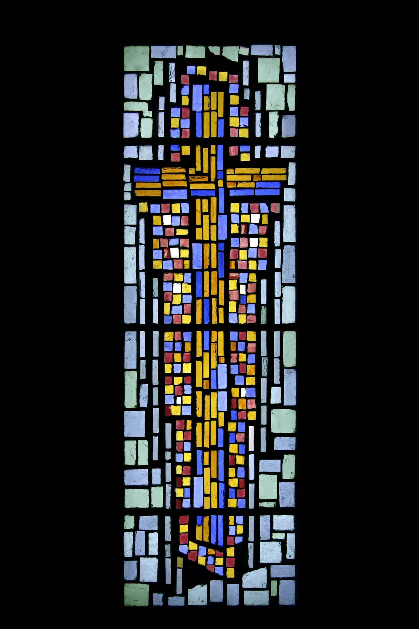 Une croix sur un fond de mosaïque rouge, bleue, blanche et jaune, encadrée d’une bordure claire.