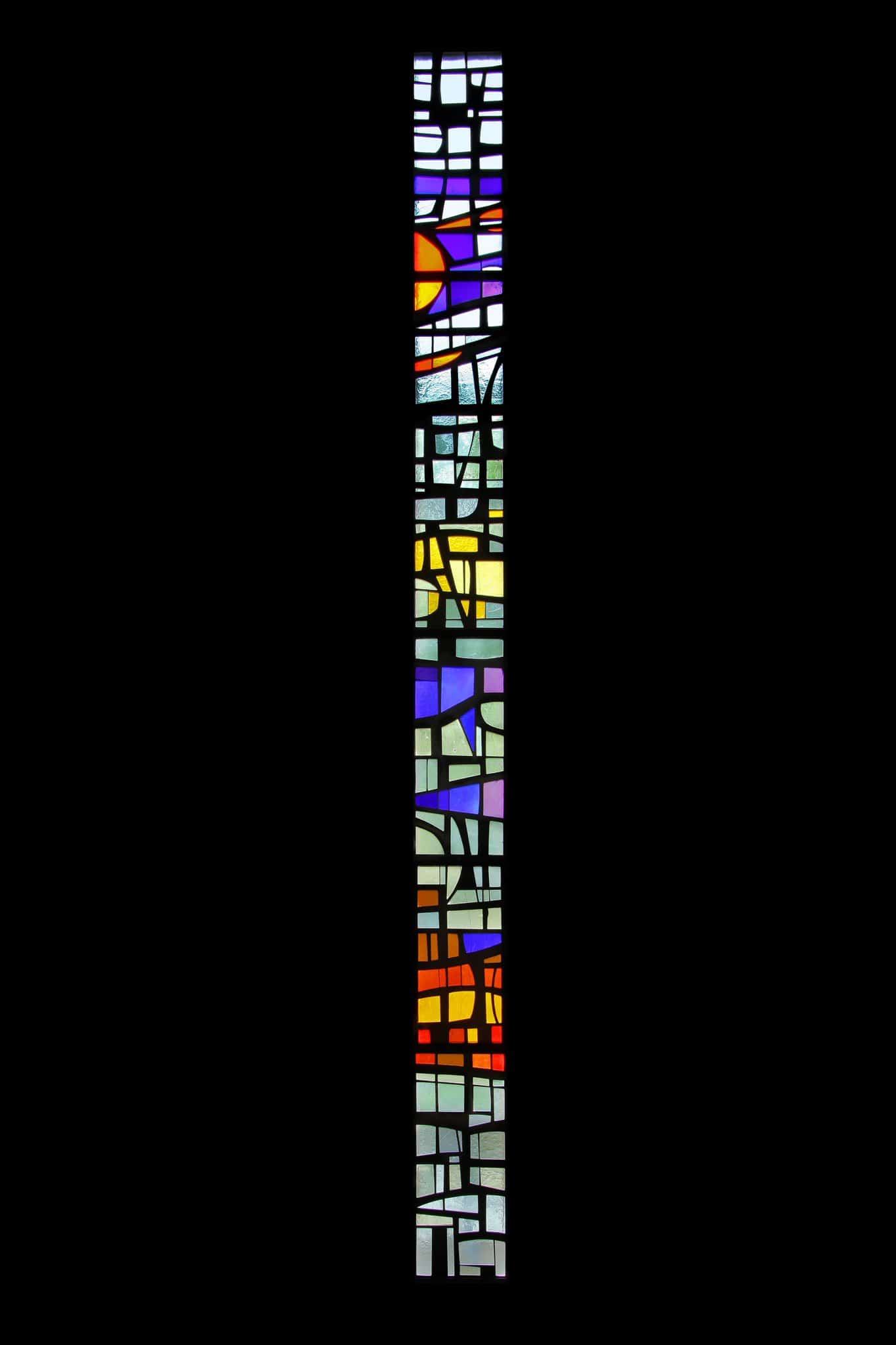 Vitrail non figuratif composé de teintes blanches, brunes, bleues, jaunes, oranges et rouges.