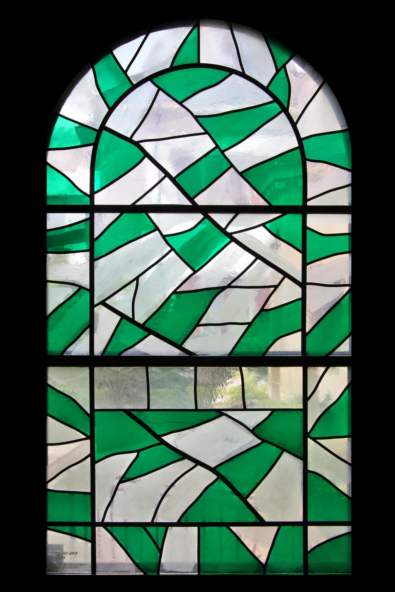 Vitrail non figuratif composé de verres verts et blancs disposés comme une mosaïque de verre. Le tout est rehaussé de grisaille.