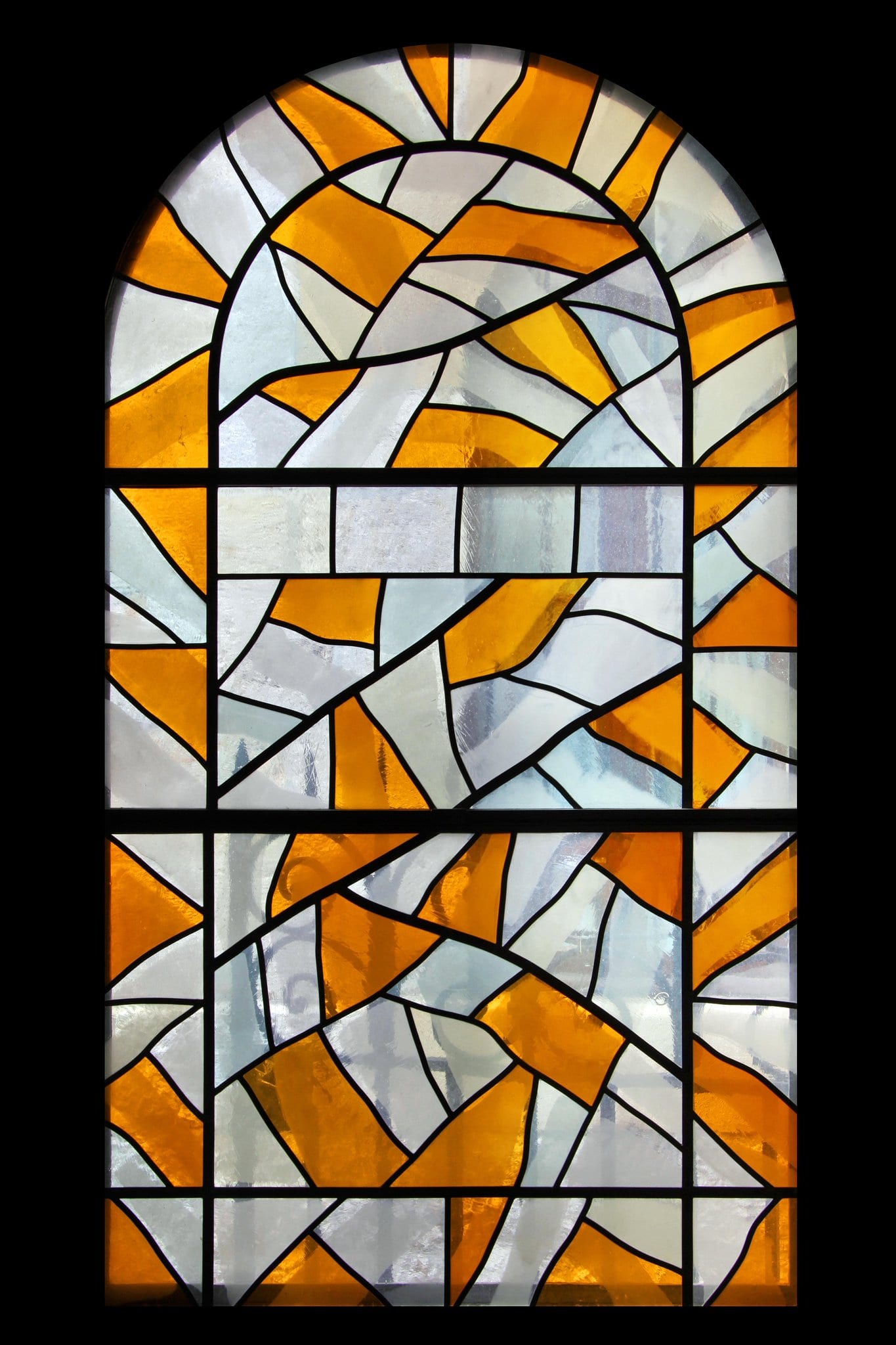 Vitrail non figuratif composé de verres jaunes et blancs disposés comme une mosaïque de verre. Le tout est rehaussé de grisaille.