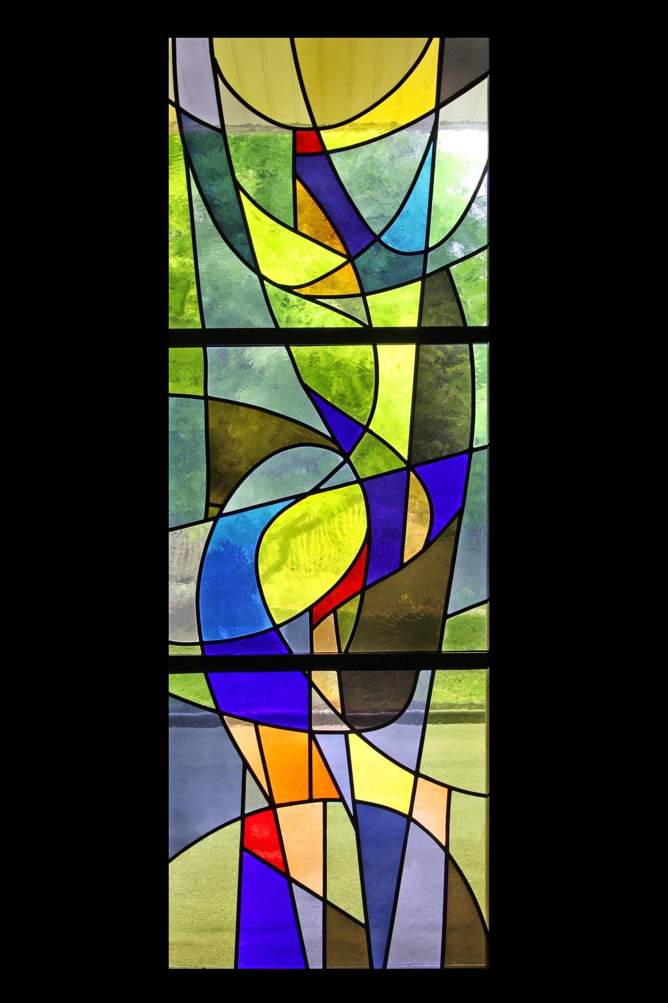 Vitrail non figuratif composé de formes très simples et aux teintes très contrastées jaunes, bleues, vertes, grises et rouges dont la transparence intègre dans la composition les arbres du parc voisin.