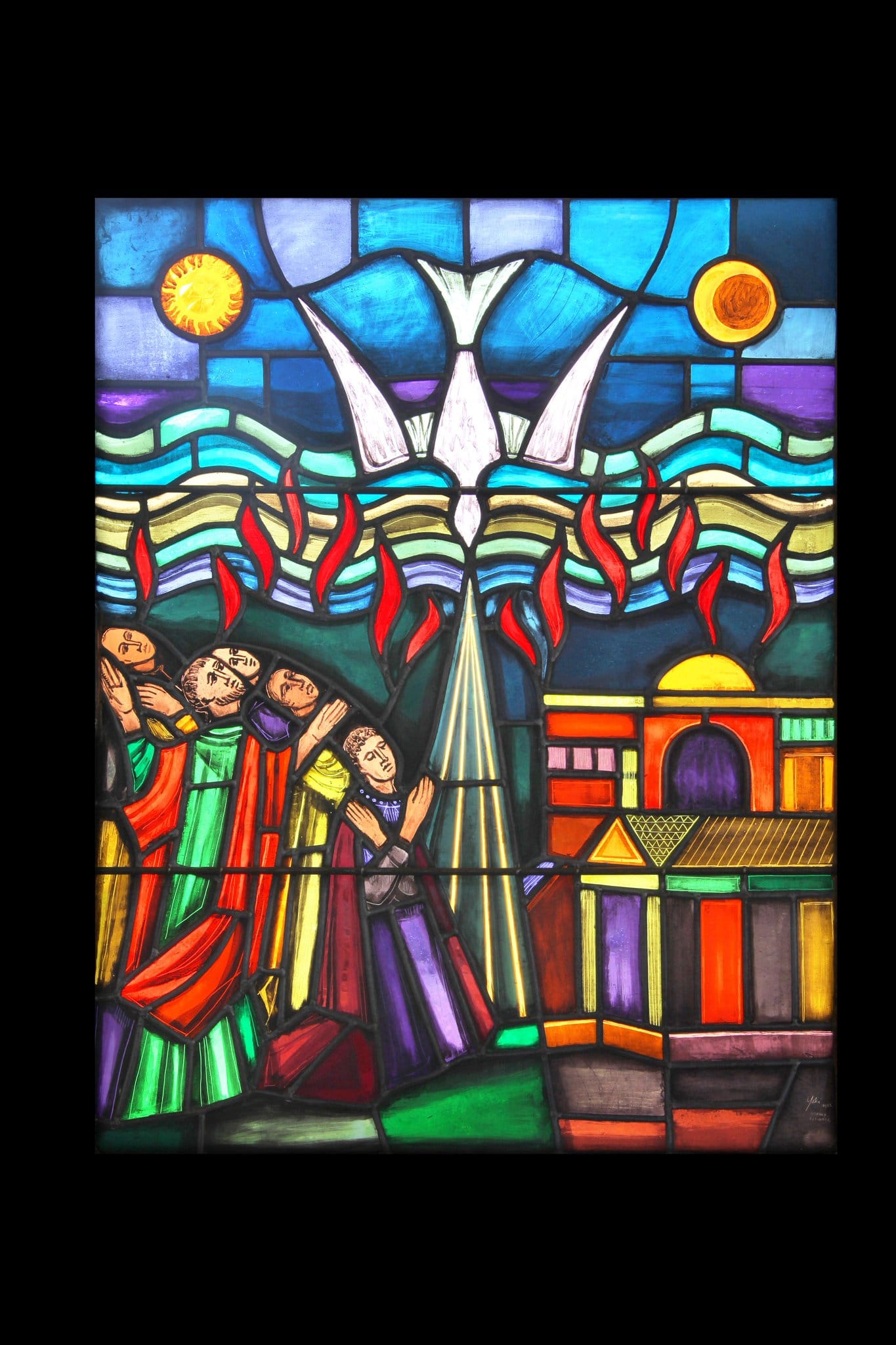 Cinq apôtres reçoivent l’Esprit Saint sous la forme de langues de feu. Au Centre la colombe envoie des rayons lumineux. A droite la ville de Jérusalem. En haut le soleil et la lune.
