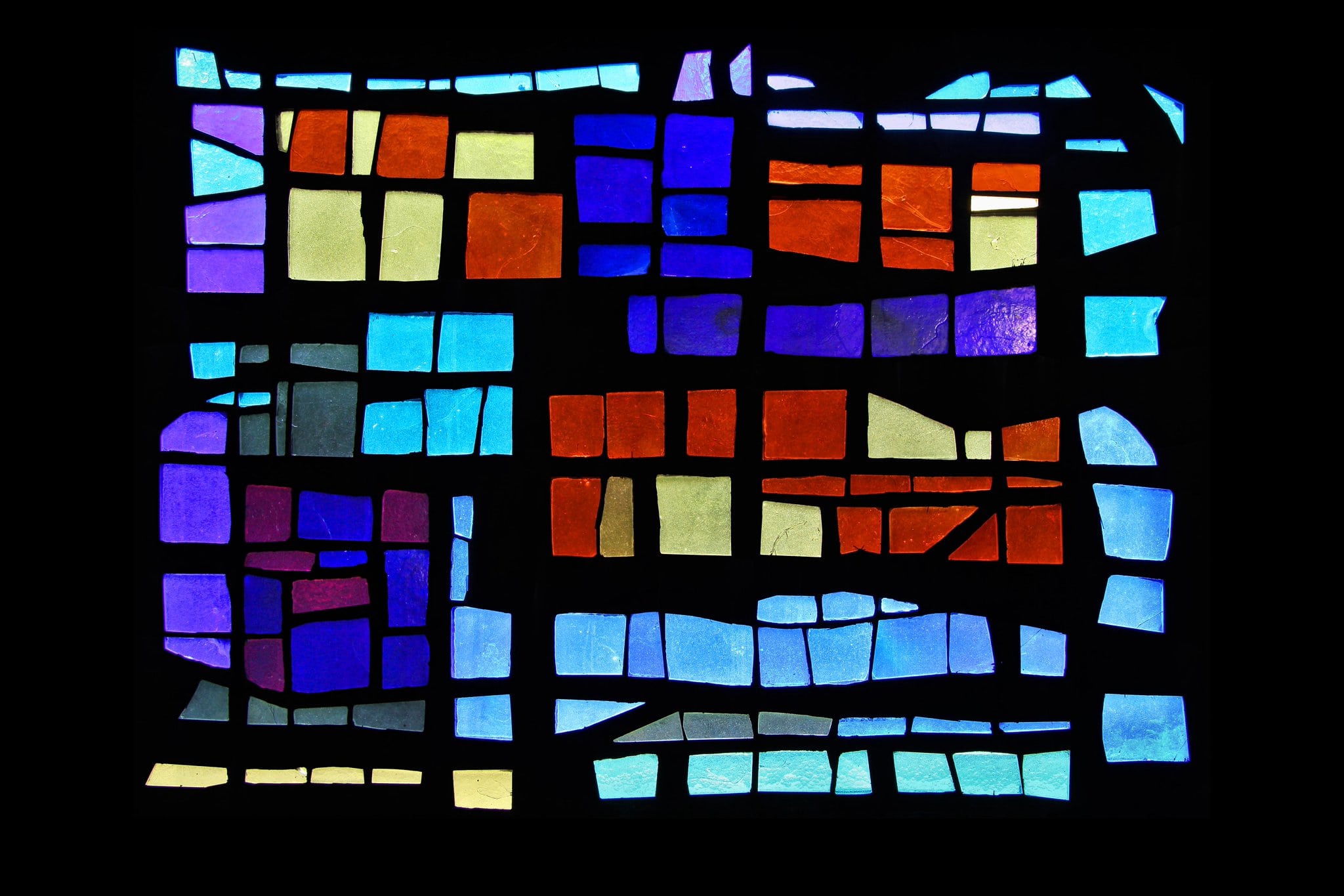 Dalle de verre non figurative composée de verres aux teintes bleues, violettes, grises et oranges. Le béton compose un dessin aux lignes variées.