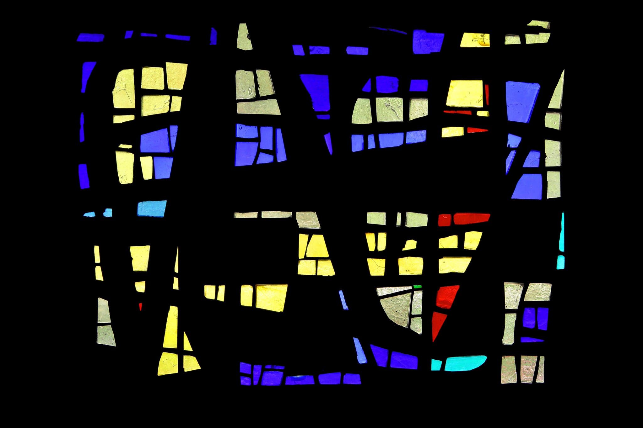Dalle de verre non figurative composée de verres aux teintes bleues, jaunes, rouges et beiges. Le béton compose un dessin aux lignes variées.