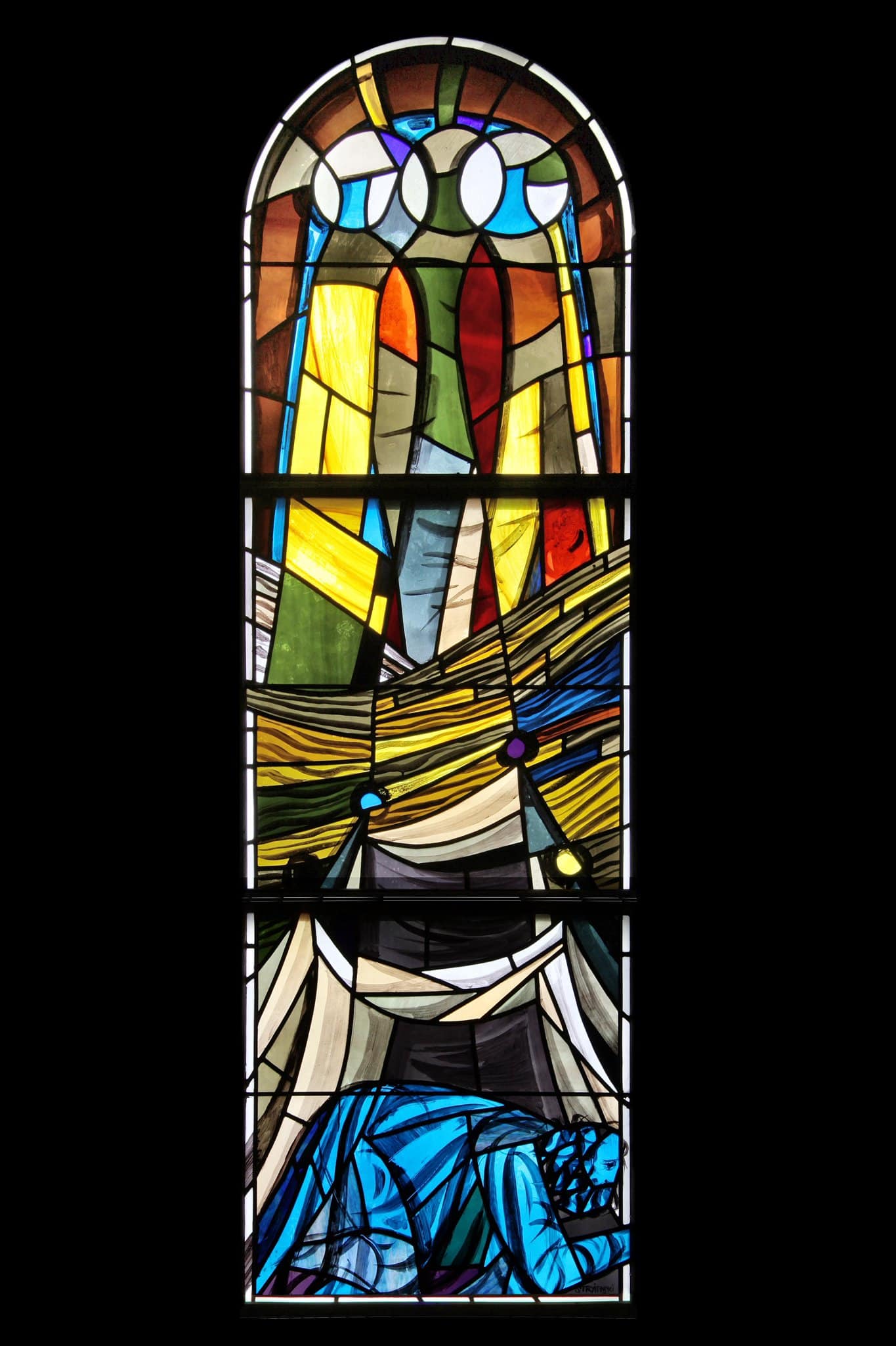 Abraham se prosterne au pied de trois pèlerins auréolés, messagers de Dieu, symbolisant la Trinité.