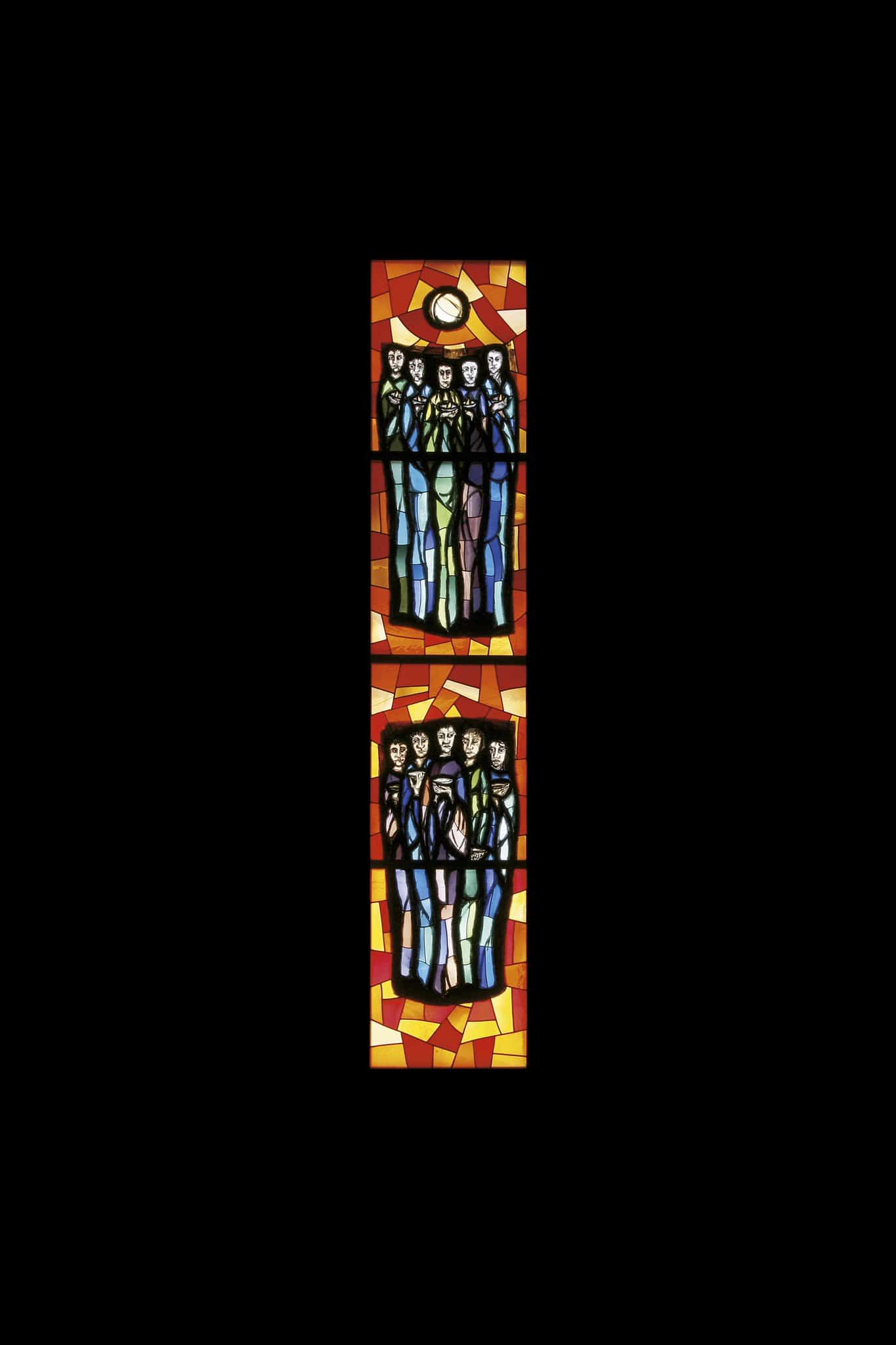En haut, cinq vierges sages tiennent leurs lampes allumées alors qu’en dessous cinq vierges folles ont leurs lampes éteintes.