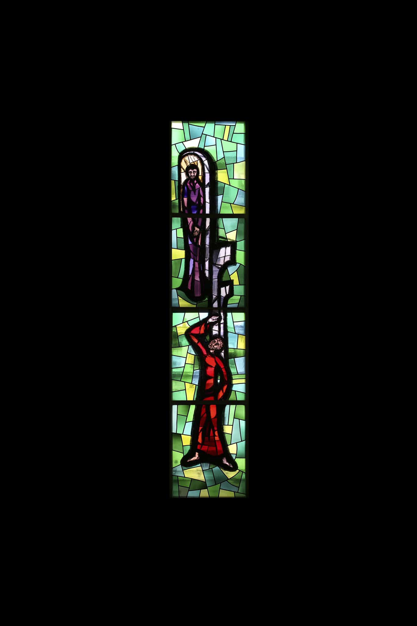Un pharisien debout devant la porte du temple prie les mains jointes alors que plus bas le percepteur d’impôts s’adresse à Dieu le bras levé pour lui demander de lui pardonner ce qu’il est.