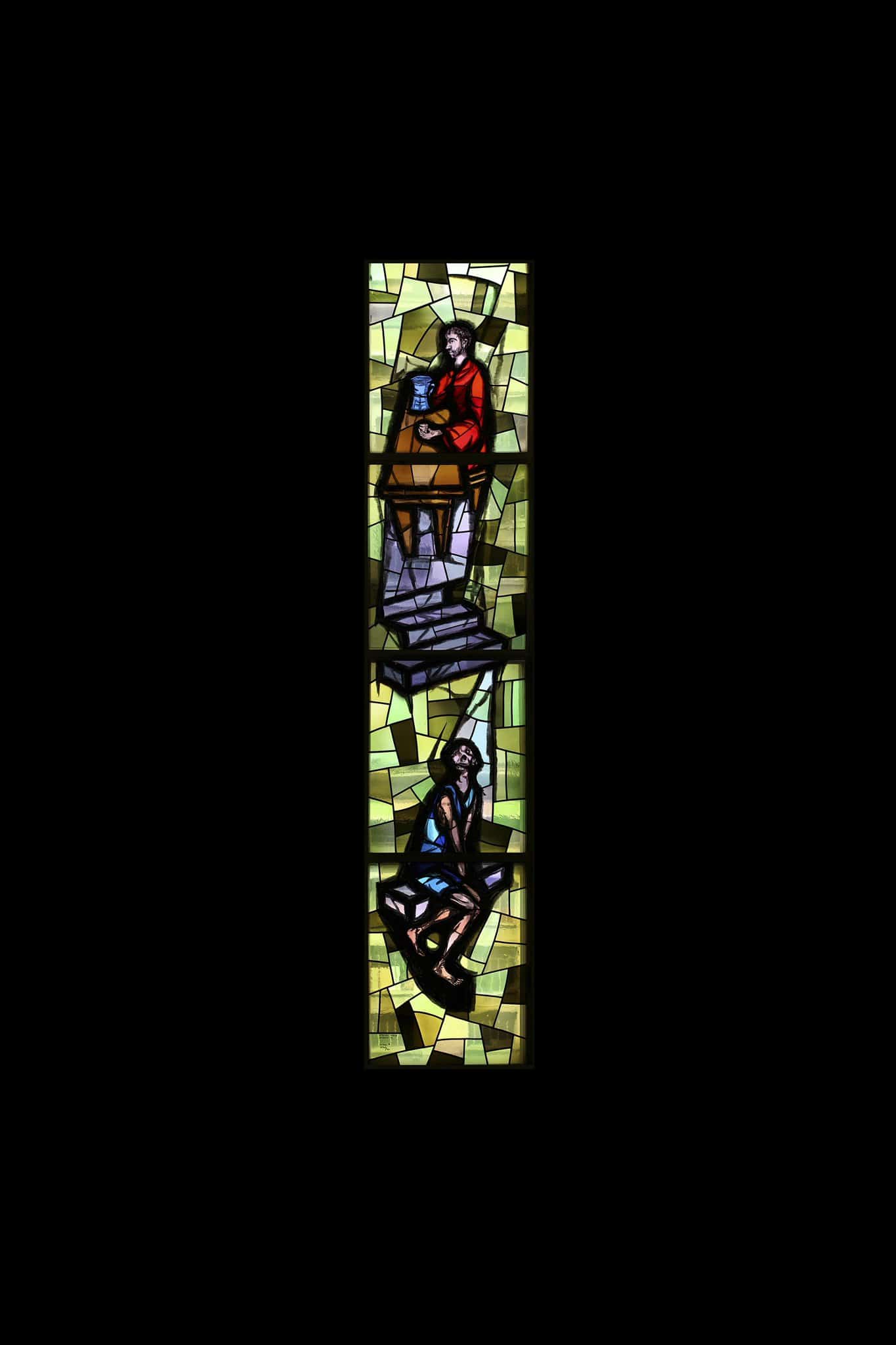 73C852 · un homme riche (Dives) festoie alors que le pauvre Lazare meurt de faim à sa porte (les chiens léchants ses ulcères) (Luc 16:19-31)