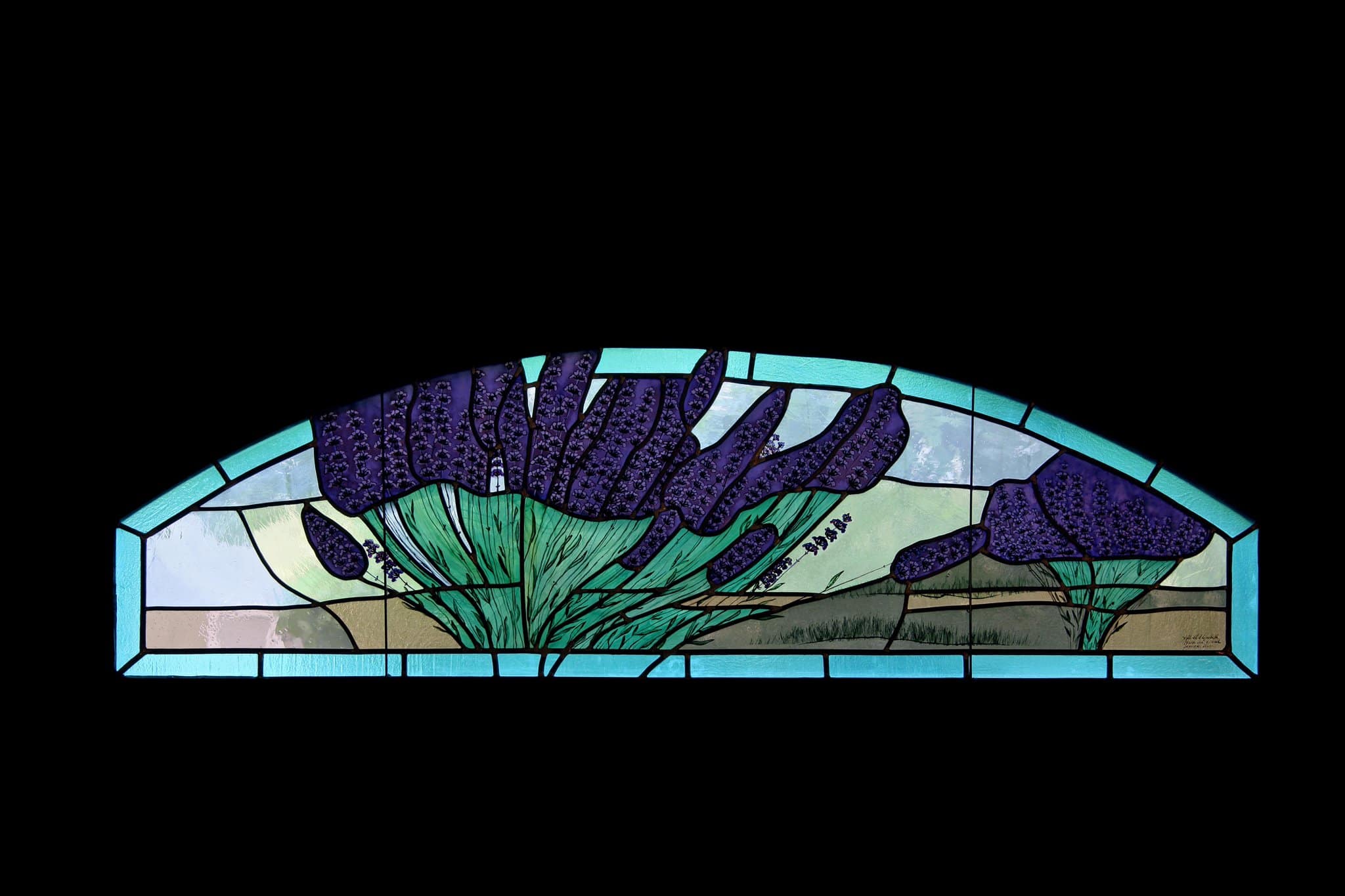 De la lavande en fleurs se déploie sur un fond de verdure parsemée.