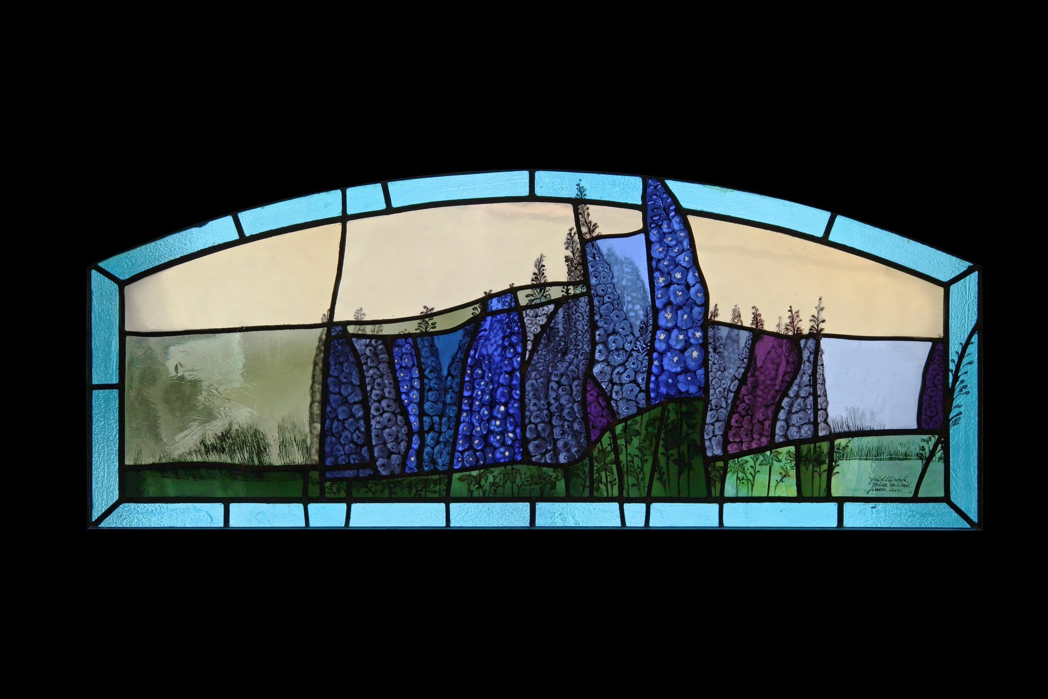 Des delphiniums bleus et violets se déploient sur un fond de verdure.