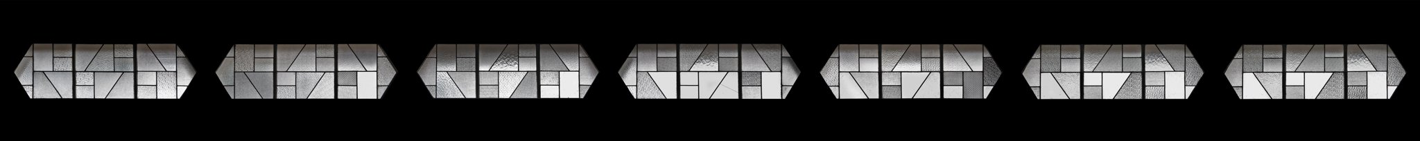 Sept fenêtres hautes géométriques composées de verres blancs aux structures diverses.