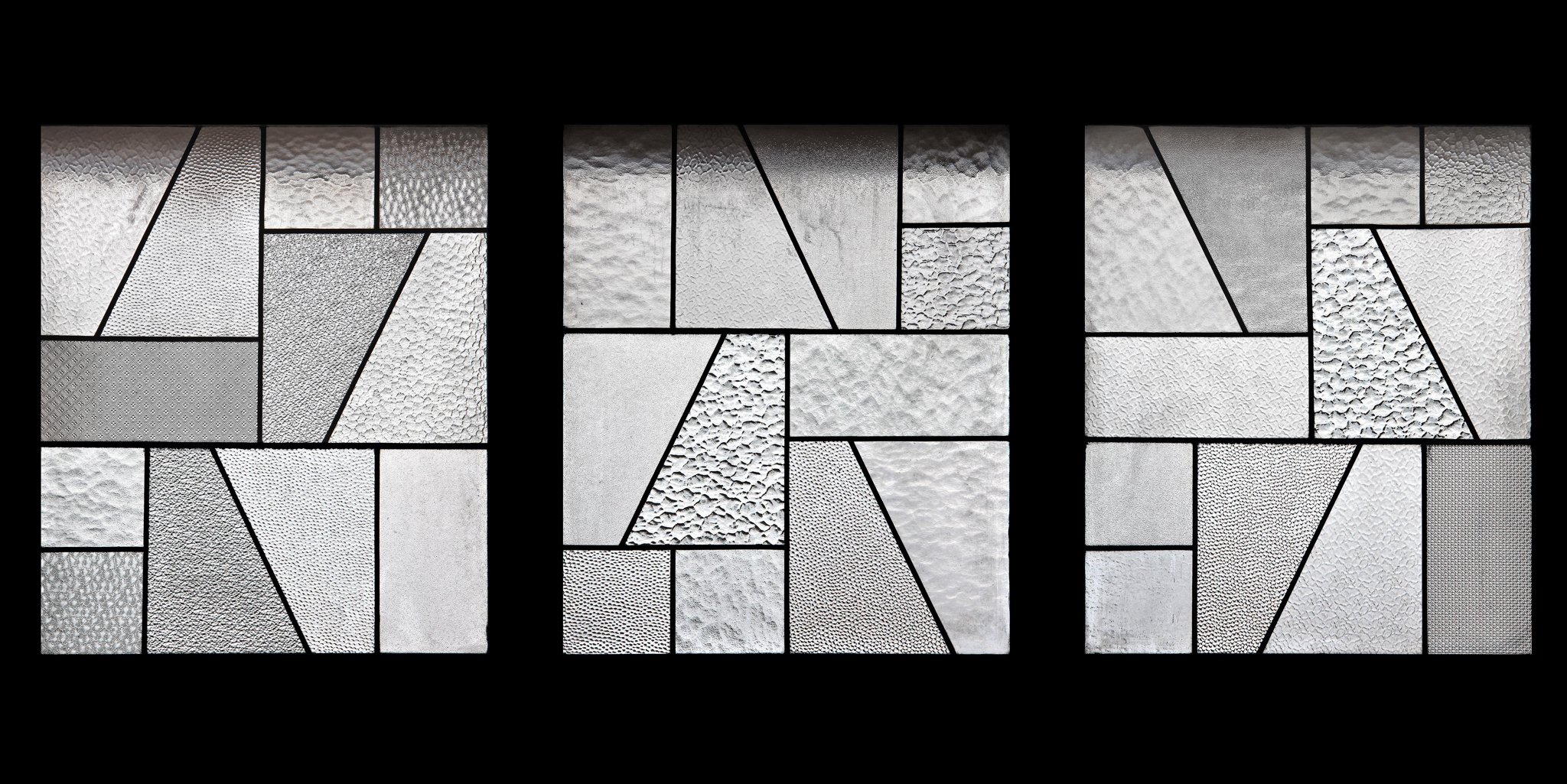 Trois fenêtres géométriques composées de verres blancs aux structures diverses.