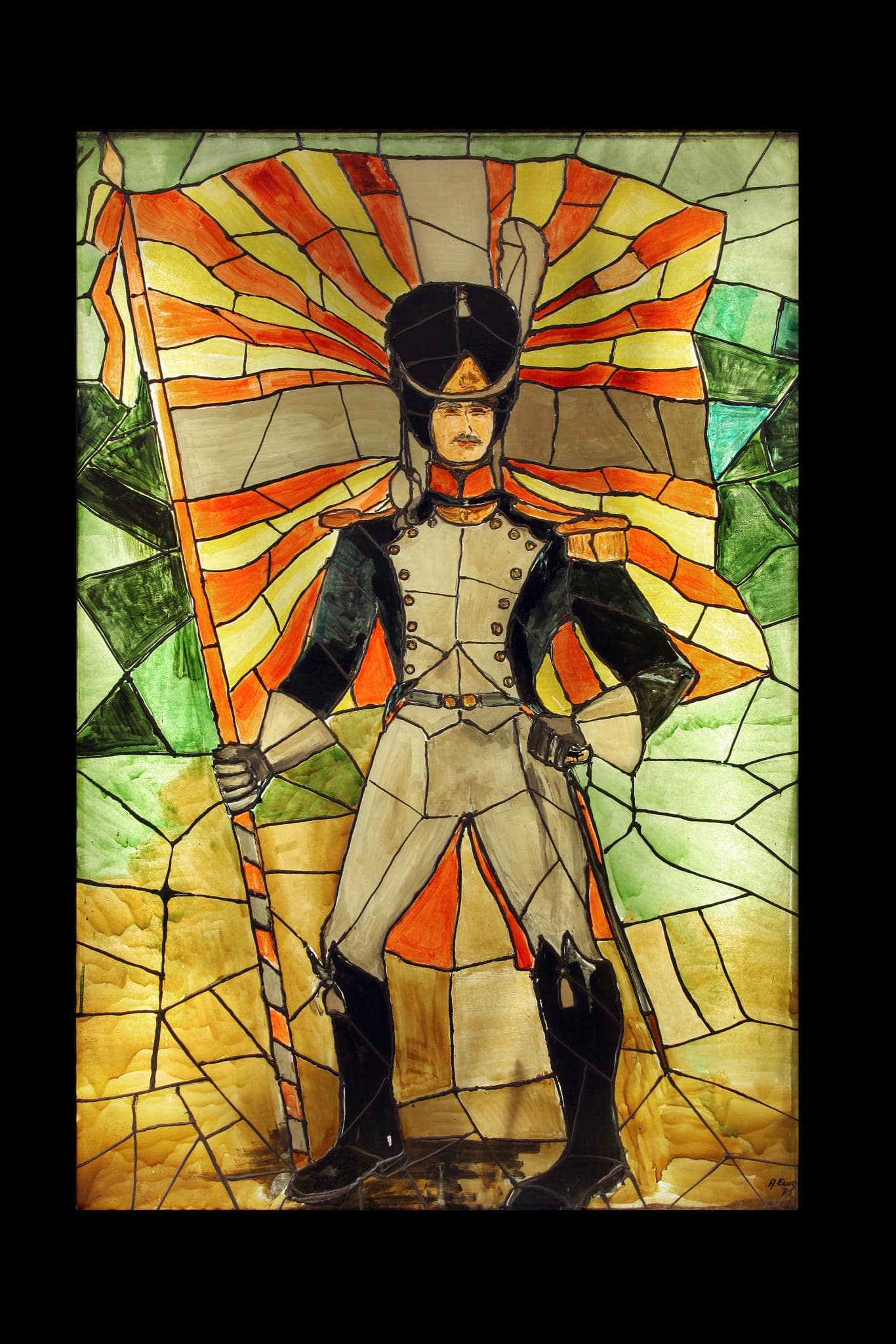 Un grenadier debout tient un drapeau de sa main droite et son épée de la gauche.