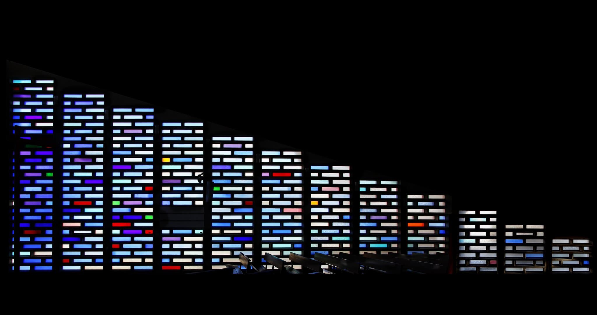 Paroi de verre de douze panneaux décroissants dans la hauteur, composés de claustras en béton à l’intérieur desquels il y a des verres doubles blancs, bleues, rouges, verts, oranges et mauves.