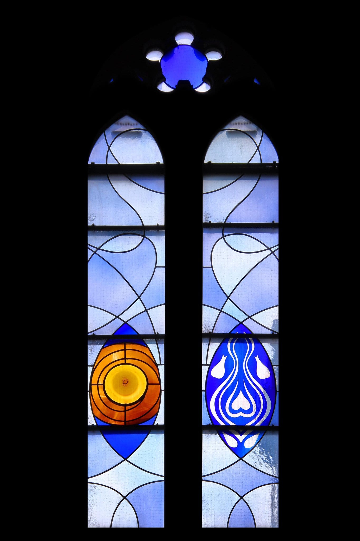Marie, Mère du Christ, priez pour nous (lancette de gauche). Marie, Mère de la grâce divine, priez pour nous (lancette de droite). Le tout sur un fond bleu avec des courbes dessinées par les plombs.