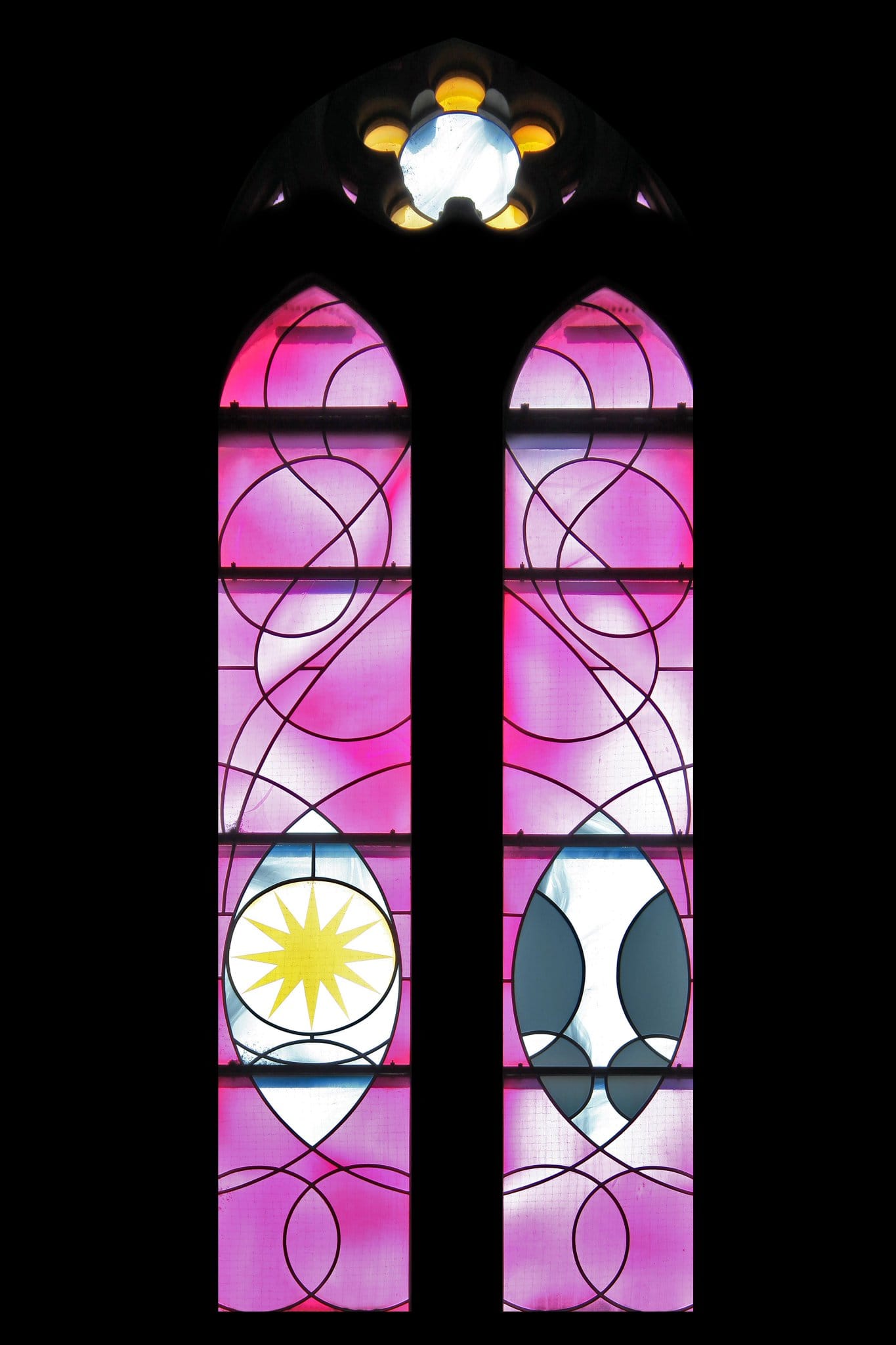 Etoile du matin, priez pour nous (lancette de gauche). Porte du ciel, priez pour nous (lancette de droite). Le tout sur un fond rose avec des courbes dessinées par les plombs.