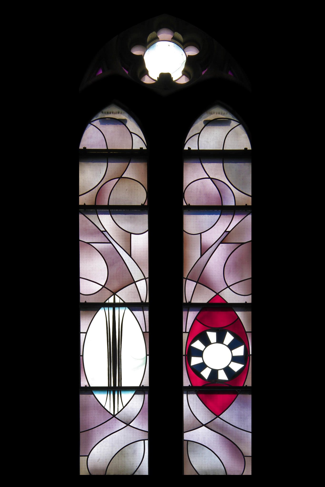 Miroir de justice, priez pour nous (lancette de gauche). Pleine de grâce, priez pour nous (lancette de droite). Le tout sur un fond gris-mauve avec des courbes dessinées par les plombs.