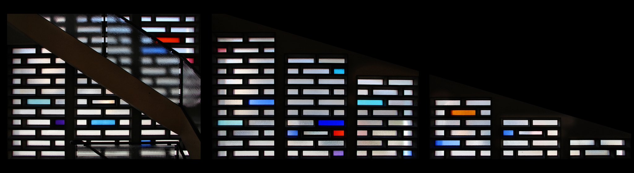 Paroi de verre de neuf panneaux décroissants dans la hauteur, composés de claustras en béton à l’intérieur desquels il y a des verres doubles blancs, bleue, rouges, oranges et mauves.